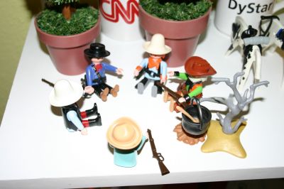 In einiger Entfernung haben 4 Cowboys Ihr Lager aufgeschlagen