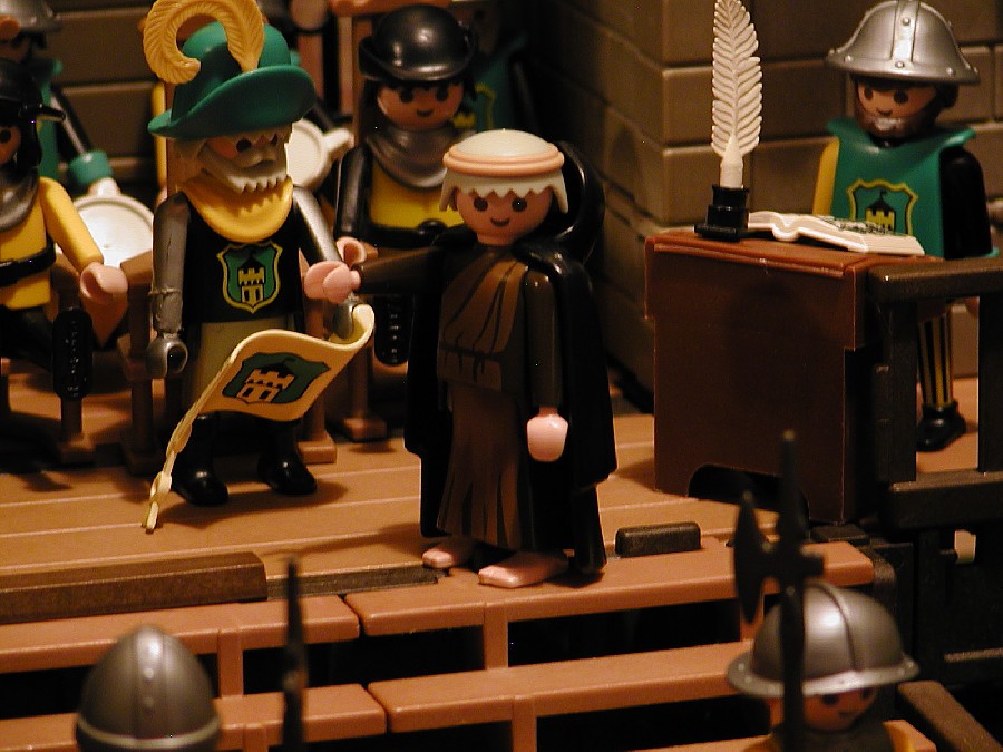 "Gott sei Dank" log er weiter, "kamen in diesem Moment die ehrenwerten Turmritter, um mich zu retten, denn dieser Hexenmeister hatte mich entdeckt und aus dem Gebüsch gezerrt."