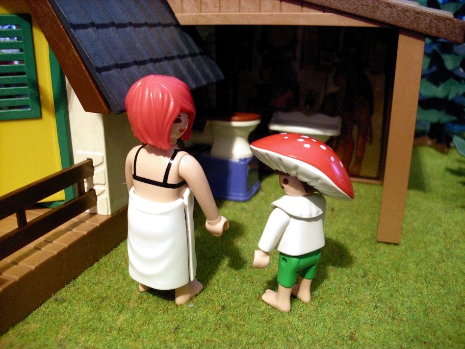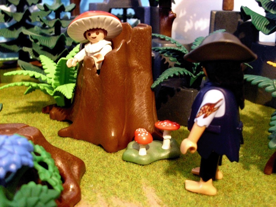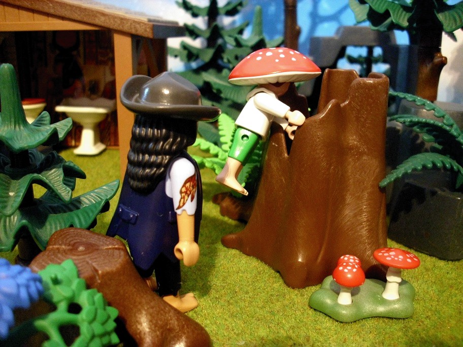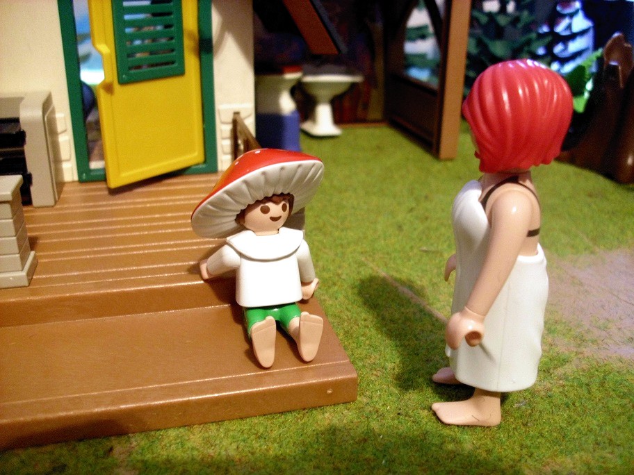 Pilzchen: „Och, die beiden sind doch so verliebt.“ Pilzchen: „Meinst Du, er zieht dann mit ins alte Forsthaus?“