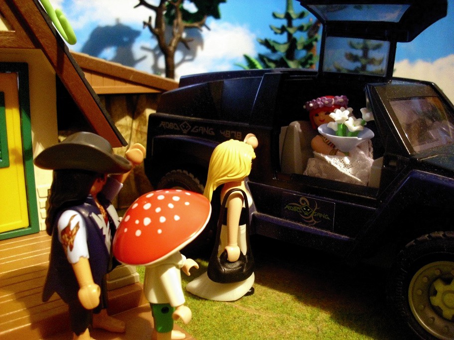 Lady Dinosaur: „Uuuuund Tschüß.“ Pilzchen: „Da fährt sie. Und wenn sie nachher wiederkommt, ist sie verheiratet.“