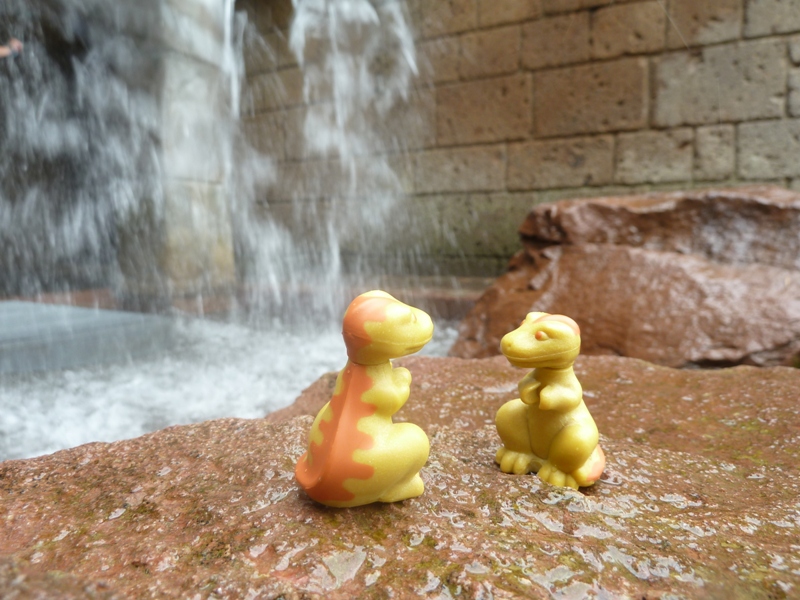 Da die Rutsche weg war, suchten sie eine andere Spielmöglichkeit und gingen baden. Sie hatten nämlich einen kleinen Wasserfall entdeckt: