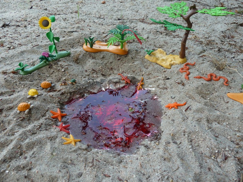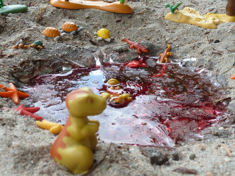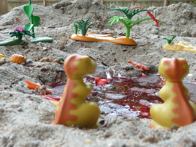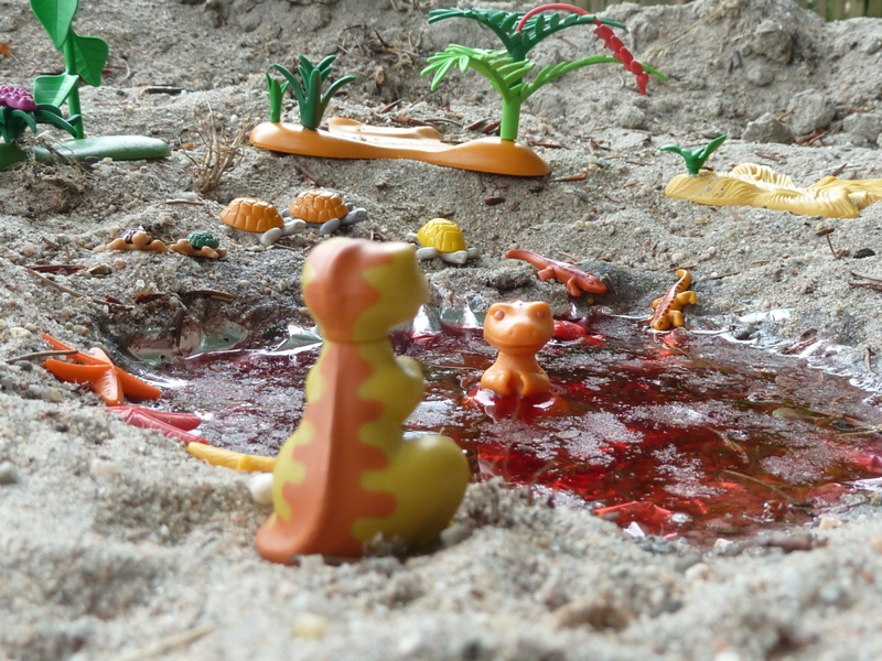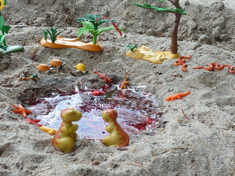 Unterdessen am Rubinsee. Das ist ein kleiner, roter See mitten in einer kleinen Wüste. Wenige Pflanzen wachsen um ihn herum und seltsamerweise auch eine Sonnenblume. Ein paar Tiere gibt es auch, die hier ständig leben.