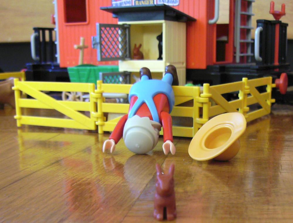 - Doch der kleine Fitz nutzt die Gunst der Stunde und springt aus dem Stall.