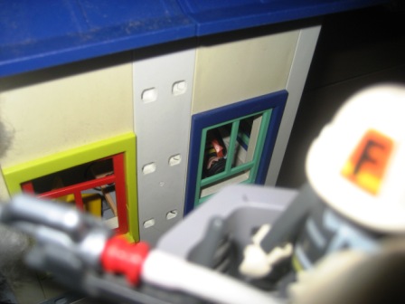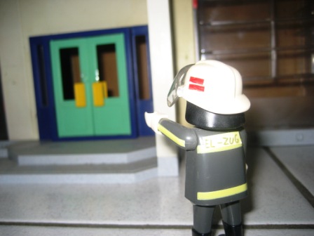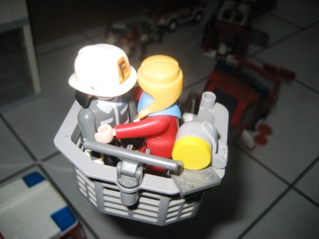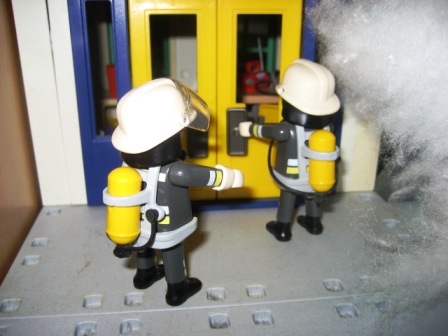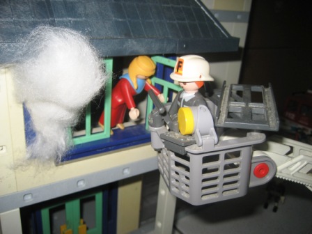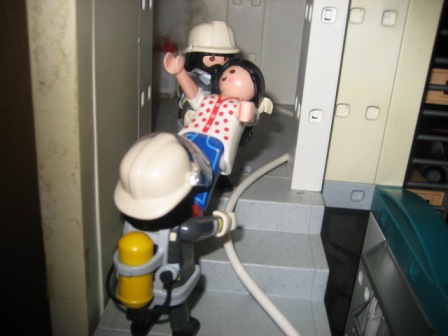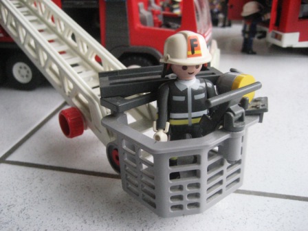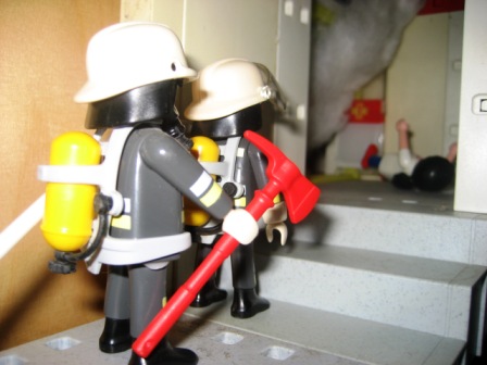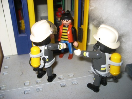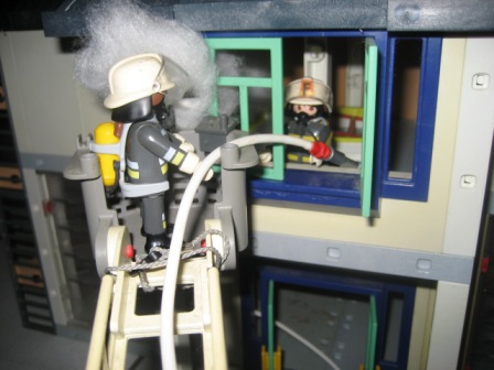 Aber eine Frage hätte ich doch noch: Müsste der Feuerwehrmann auf der Drehleiter, der die Frau am Fenster rettet nicht eigentlich auch Atemschutz tragen, denn das Feuer ist ja relativ dicht dran?