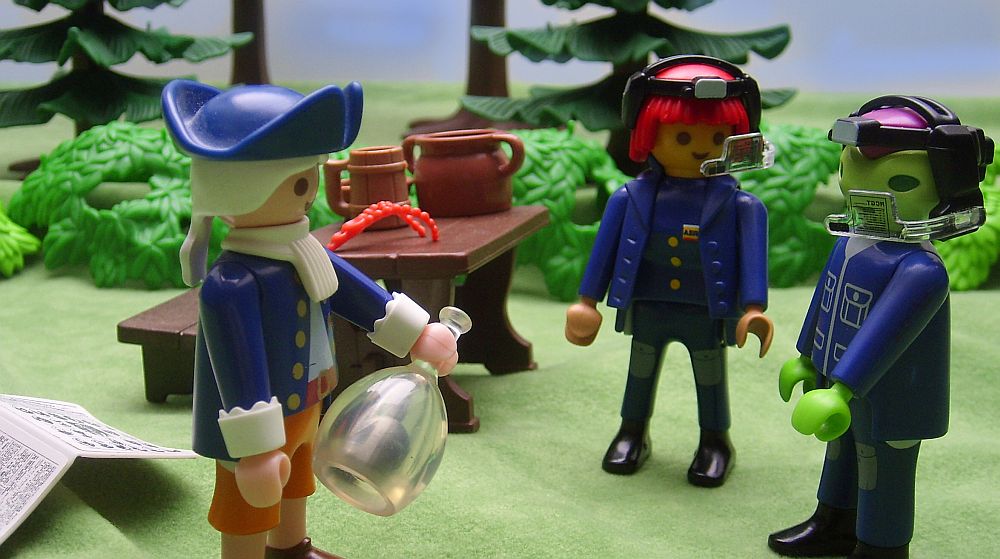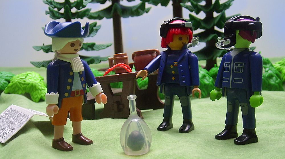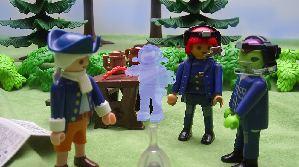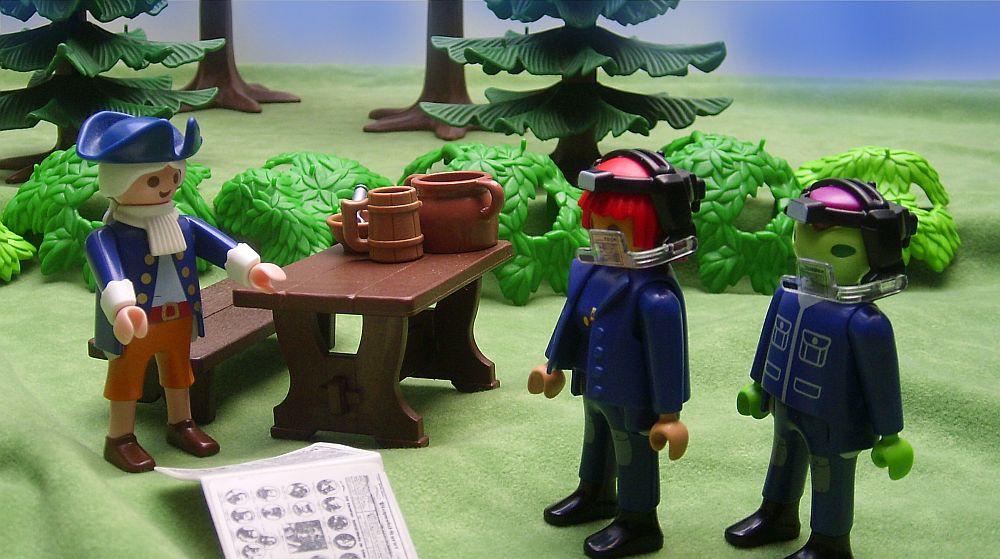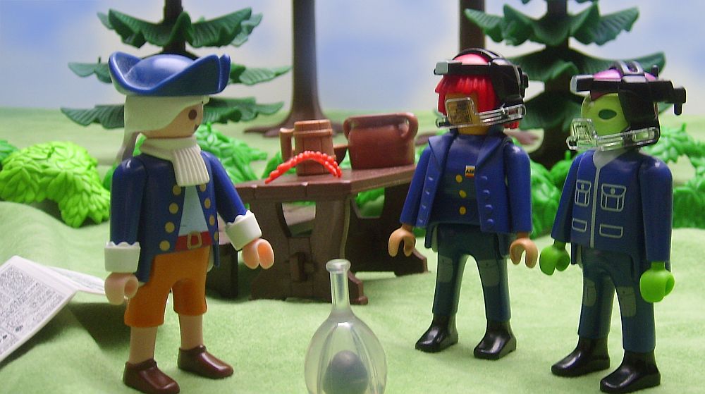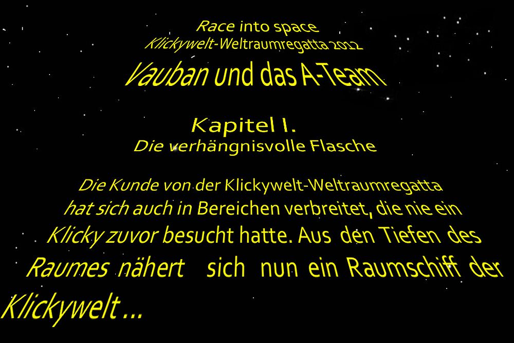 Plötzlich erscheint über der Flasche das Hologramm eines weiteren Außerirdischen. Er scheint sich mit jemandem im Hintergrund zu unterhalten und hat Vauban den Rücken zugekehrt. “Meine umfangreichen Studien dieser niederen Lebensformen hat ergeben, dass die Flaschenpost ein gängiges Kommunikationsmittel auf dieser Welt ist. Jetzt schweigt, ich habe zu tun.” Dann dreht der Außerirdische sich nach vorne und der halslose Kopf blickt auf Vauban. “Ich grüße dich, primitive Lebensform. Der Rat der Zwölf hat von eurem Rennen durch die Galaxis erfahren und beschlossen, daran als Sieger teilzunehmen. Zur Vereinfachung der Kommunikation über unseren Sieg sollst du uns dabei unterstützen.” Aufgrund seiner Herkunft sieht Vauban sich in der Lage, all die Fragen, die auf ihn einstürmen, mit eloquenter Genauigkeit auf einen Punkt zu bringen. “HÄH??”