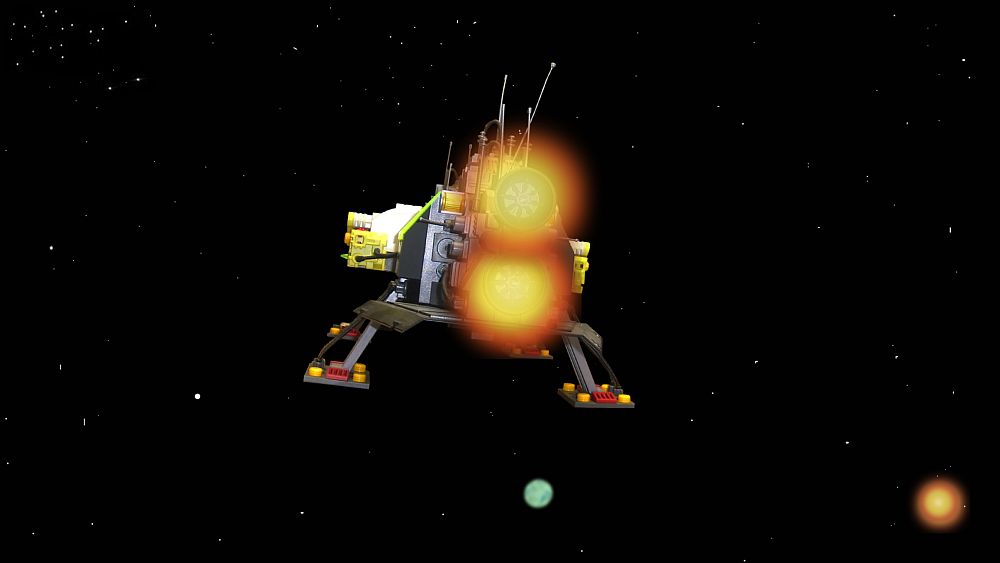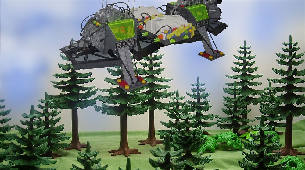 Mit der Grazie eines Bleisenklotes durchstößt die ehemalige Hupftiegel die Atmosphäre des Planeten und nähert sich mit berauschend beängstigender Geschwindigkeit einem kleinen Wald. Zunächst versuchen die Bäume den Gewalten der jaulenden Anti-Grav-Projektoren noch zu trotzen.