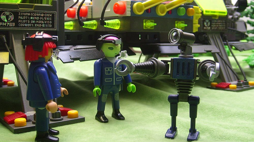 “Ihr Wunsch ist mir Befehl”, schnarrt der Roboter. “Natürlich ist das ein Befehl. Die Luke sollte doch schon längst ausgetauscht worden sein.” ED schüttelt die große Optikeinheit, die er anstelle eines Kopfes auf den Schultern trägt. “ Die bereitgestellten Kredits wurden dringend für Schmiermittel benötigt.” “Du versoffenster aller Roboter…”, poltert Iba los, wird aber sofort wieder von Korben unterbrochen, der ausnahmsweise auf ED-08’s Seite steht - wahrscheinlich deswegen, damit er so gegen seinen Captain sein kann.“ Sein Sprachprozessor müsste auch erneuert werden. Wir mussten damit die Schmiergelder an den Sicherheitsdienst bezahlen, als du wieder in der Kneipe randaliert hattest.” Iba schluckt ihren Zorn runter und wiederholt nur noch kurz ihre Anweisung. “Bring das in Ordnung, bis wir zurück sind!” “Diese Präzisionsgreifer werden wieder einmal Wunder tun.” ED muss mal wieder das letzte Wort behalten.