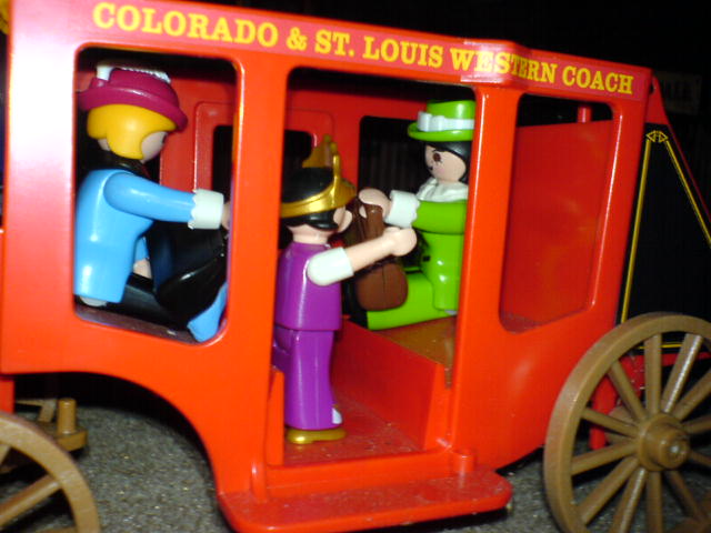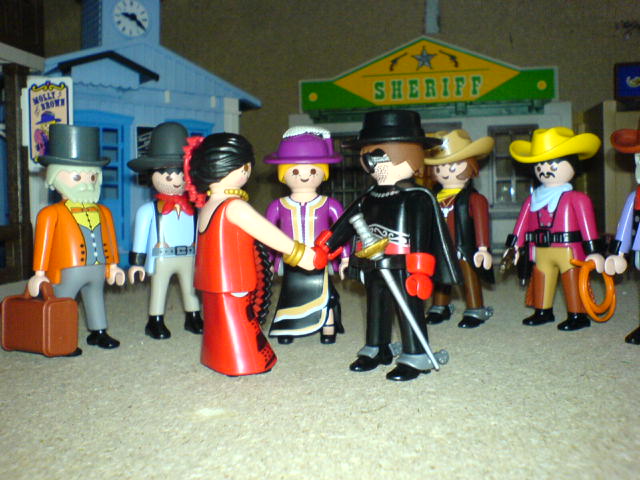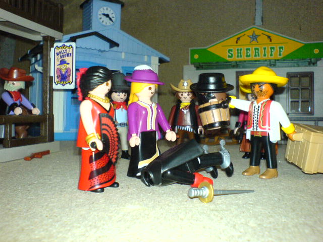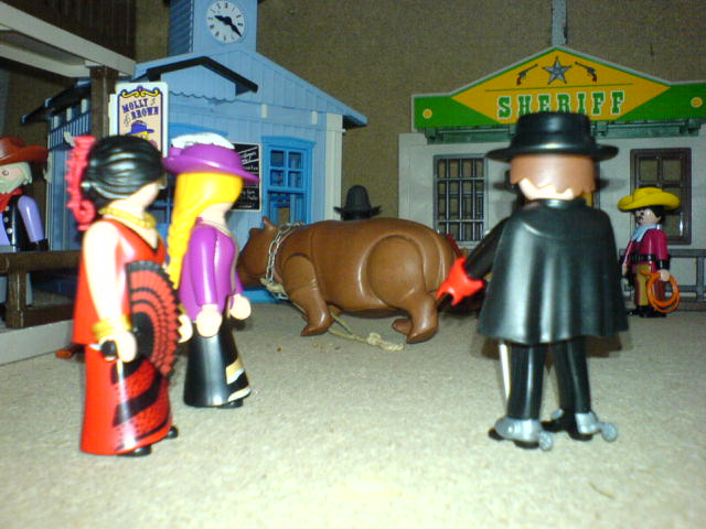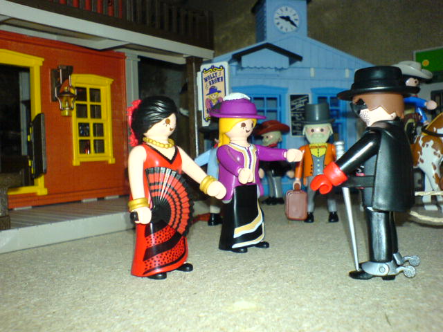 "Fritz, unser Besitzer hat festgestellt, dass der Frauenanteil in seiner Western-, Piraten- und Indianerwelt sehr zu wünschen übrig lässt. Daher hat er sich auch einmal die Playmobil Figures Girl zu Gemüte geführt, und festgestellt, dass da einige sehr bezaubernde Klickys dabei sind." :hop "Aha?!" :brille "Carmen hier, ist eine unserer letzter Neuzugänge hier in der Westernwelt. Sie wird Teilhaberin im Golden Nougat Salon.""Du meinst Golden Nugget Saloon?!""!El sabelotodo!" :grrr