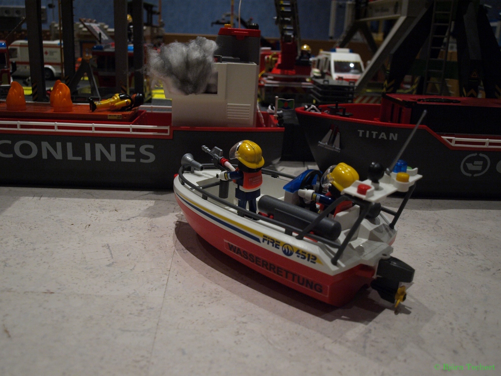 "Lagemeldung, Brand auf einem Frachter mit Autoteilen, Gefahr der Ausbreitung. Nachforderung, Atemschutz, Wasserschutzpolizei, Seeseitliche Unterstützung durch Feuerwehr und Seenotretter, Freiwillige Feuerwehr, kommen"