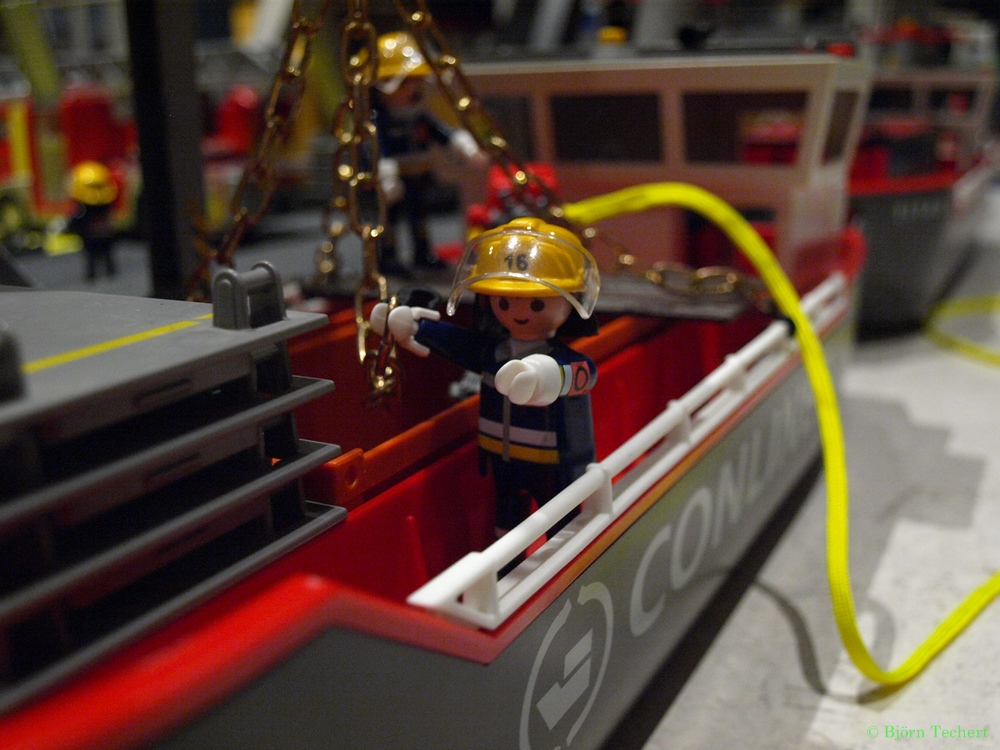 Dort warten sie mit dem Hafenleiter auf die Feuerwehr.