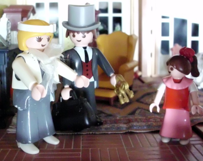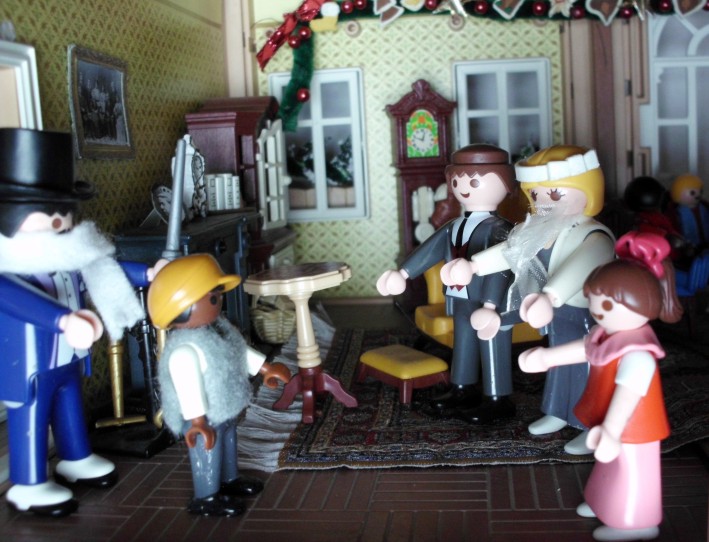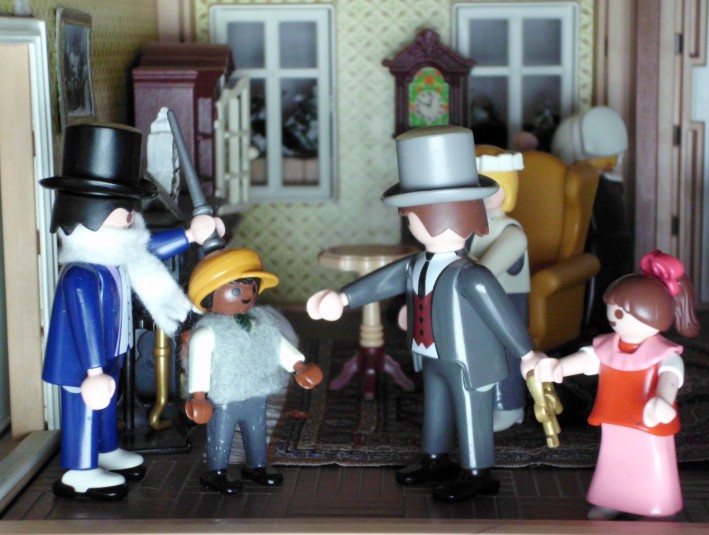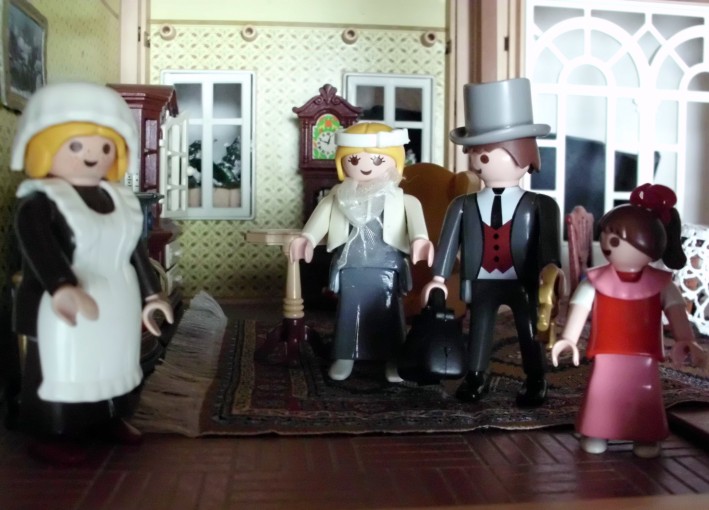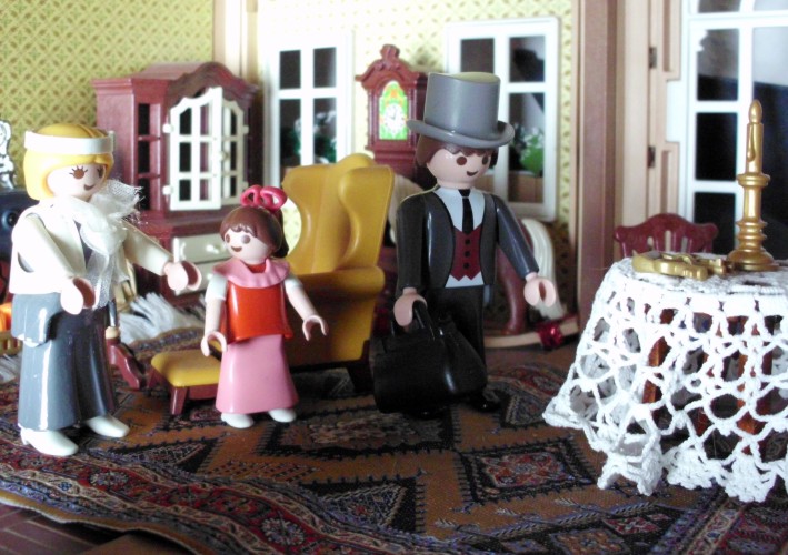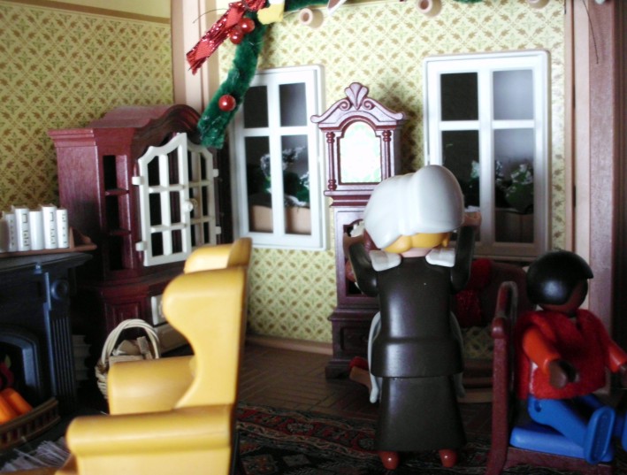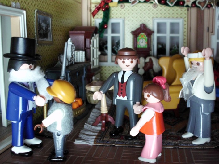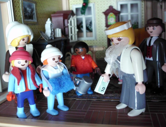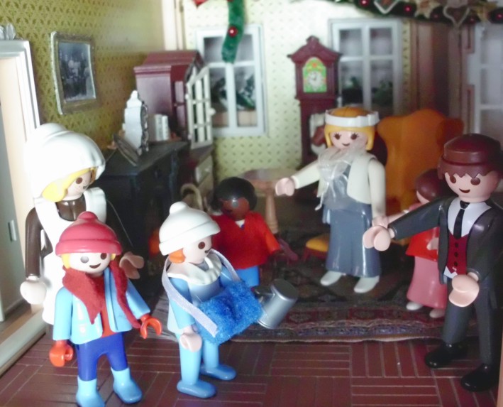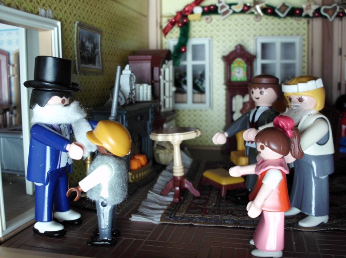Umgesetzt habe ich diesen Gedanken in meinem Lieblingsambiente ... meinem Nostalgie-Puppenhaus zur Zeit von Agatha Christie, mit kräftigen Anleihen an den Weihnahtsklassiker "Ist das Leben nicht schön?" Ursprünglich geplant als Beamer-Präsentation, zu der die Kinder den Text lesen (wie gesagt ... Probenmarathon so kurz nach meinem Bibelevent ...), waren die Kinder so begeistert von dem Stück, dass sie es unbedingt spielen wollten! So habe ich den Anfang als Erzählversion mit Beamerbildern gelassen und den Rest als Theaterversion umgeschrieben.