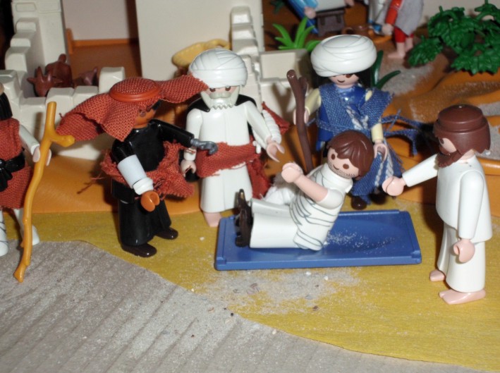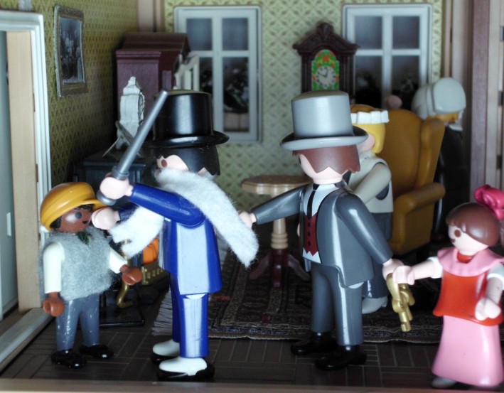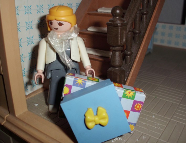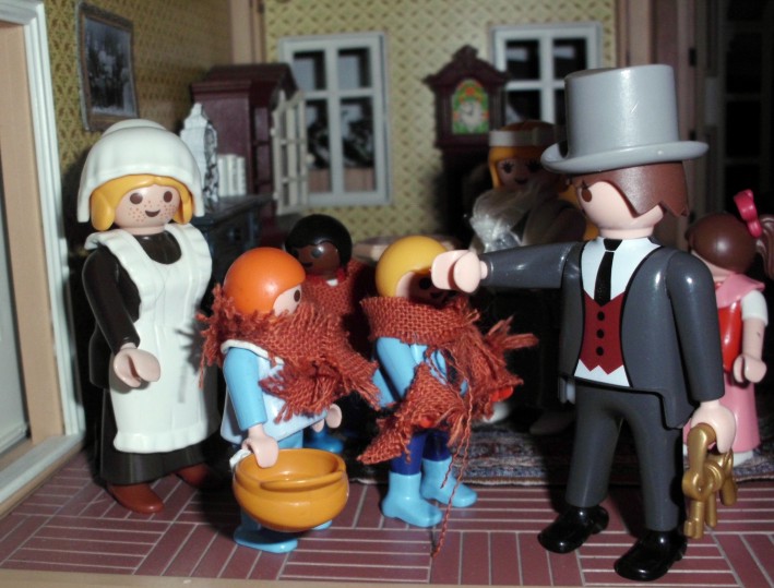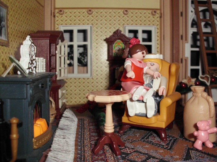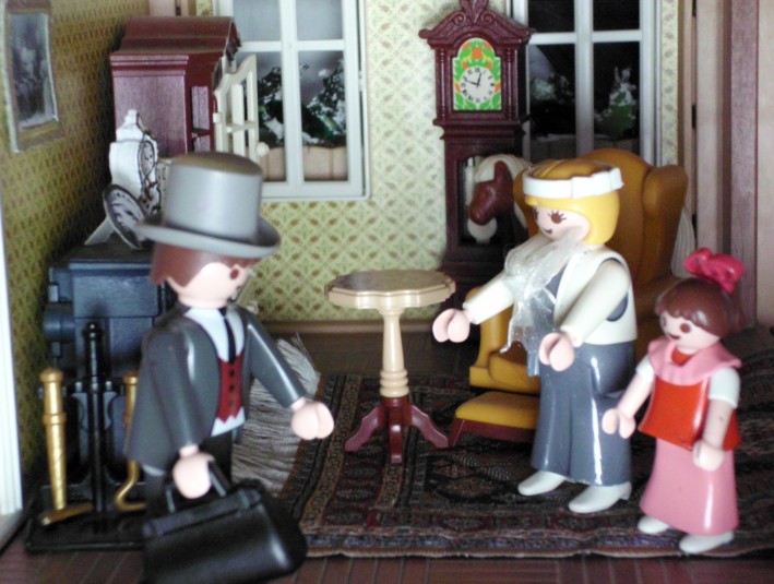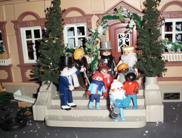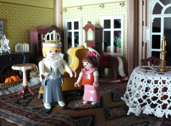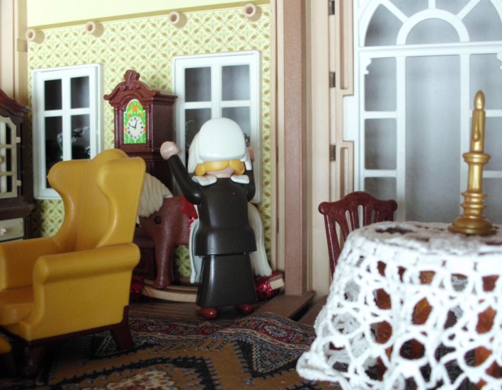 Umgesetzt habe ich diesen Gedanken in meinem Lieblingsambiente ... meinem Nostalgie-Puppenhaus zur Zeit von Agatha Christie, mit kräftigen Anleihen an den Weihnahtsklassiker "Ist das Leben nicht schön?" Ursprünglich geplant als Beamer-Präsentation, zu der die Kinder den Text lesen (wie gesagt ... Probenmarathon so kurz nach meinem Bibelevent ...), waren die Kinder so begeistert von dem Stück, dass sie es unbedingt spielen wollten! So habe ich den Anfang als Erzählversion mit Beamerbildern gelassen und den Rest als Theaterversion umgeschrieben.