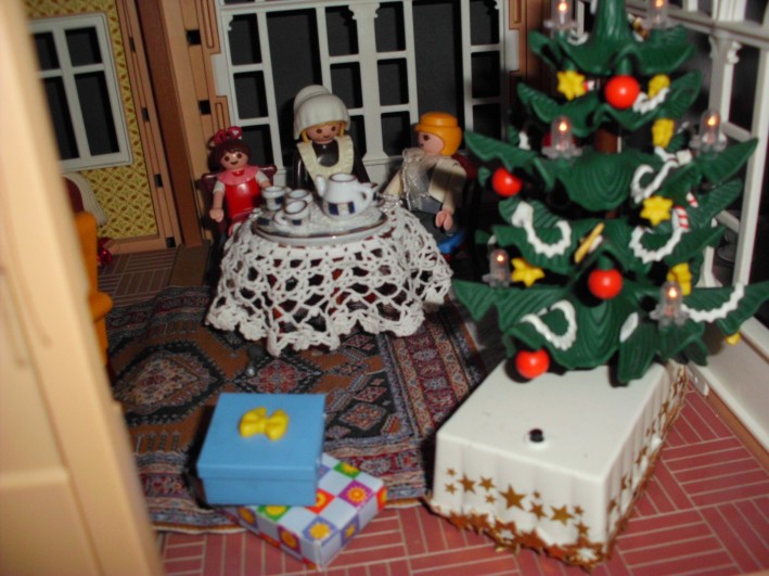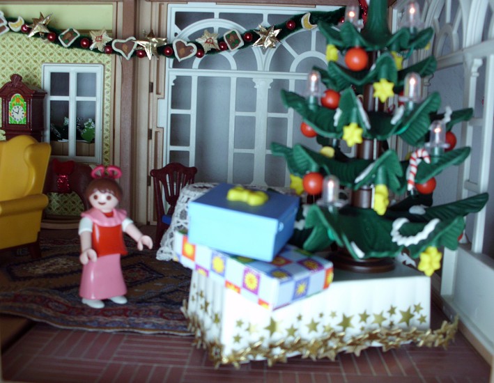 Flink zog sie sich an und stürmte hinunter in den Salon. Auch dort war alles wieder da! Der Weihnachtsbaum, die Girlande und ihre Geschenke für Mama und Papa.