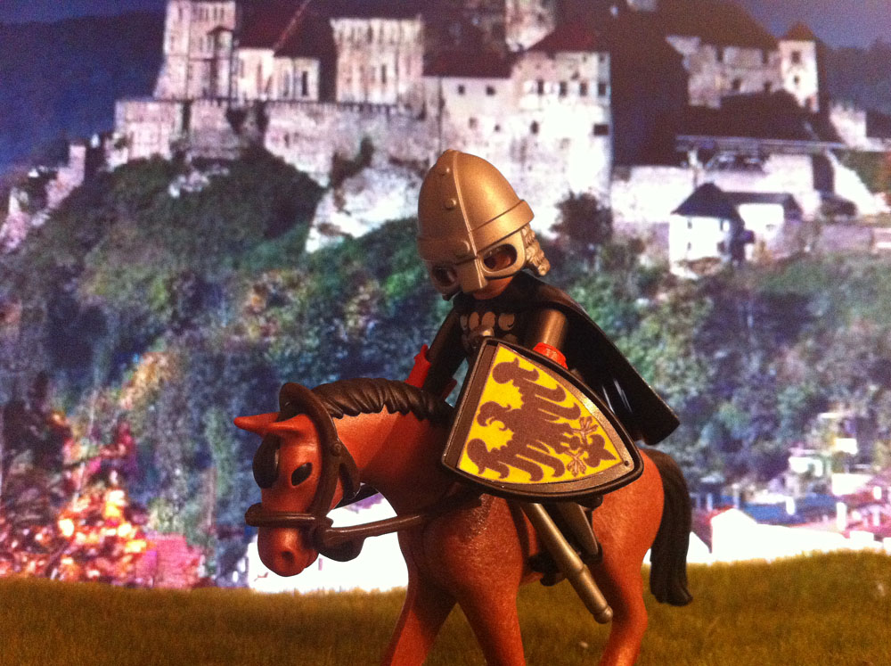Graf Reinhard Stranz von Braunau. Ursprünglich hieß der er ja Graf Reinhard von Burghausen. Nach einem Ortswechsel, den seine Frau anstrebte, nannte er sich nach dem Ort in dem er wohnte und dass war das mittelalterliche Braunau am Inn. An seinem Helm kann man erkennen, dass seine Vorfahren Wikinger waren.