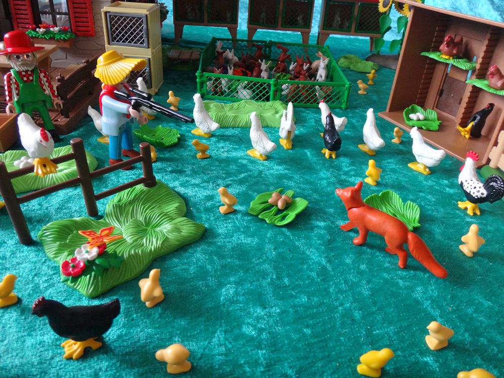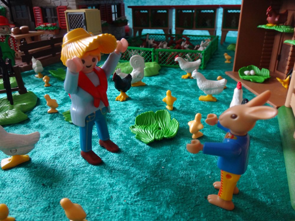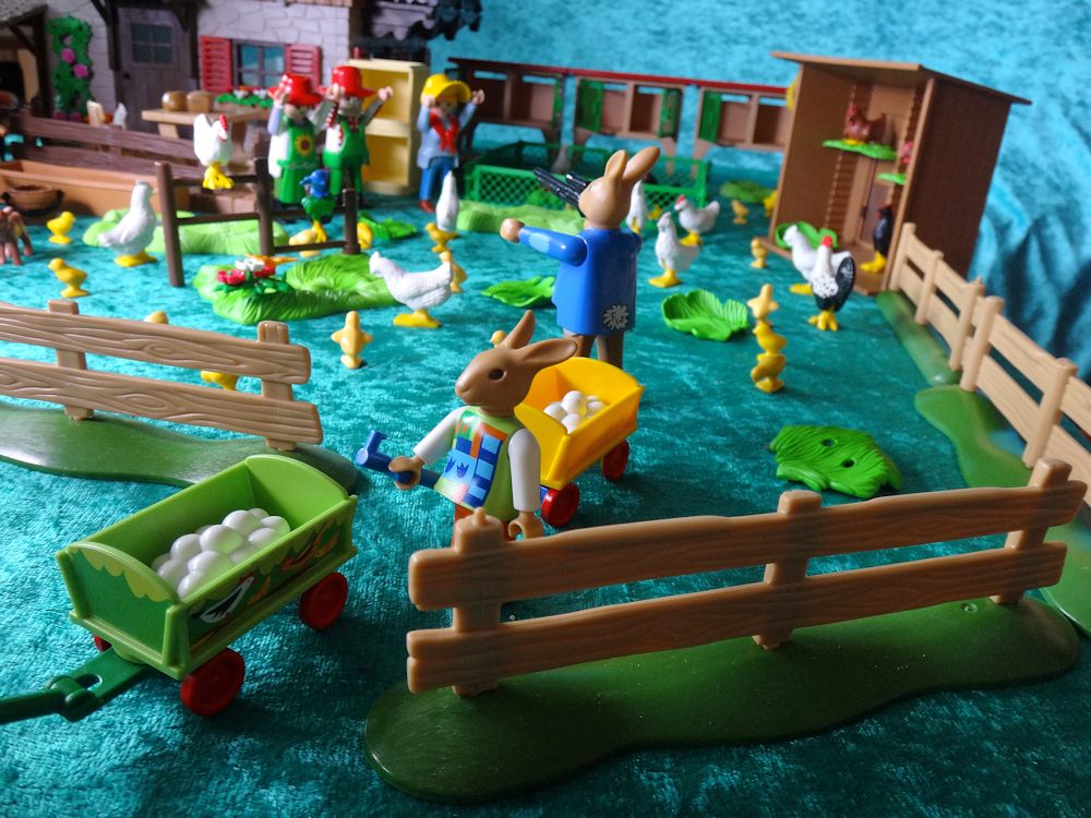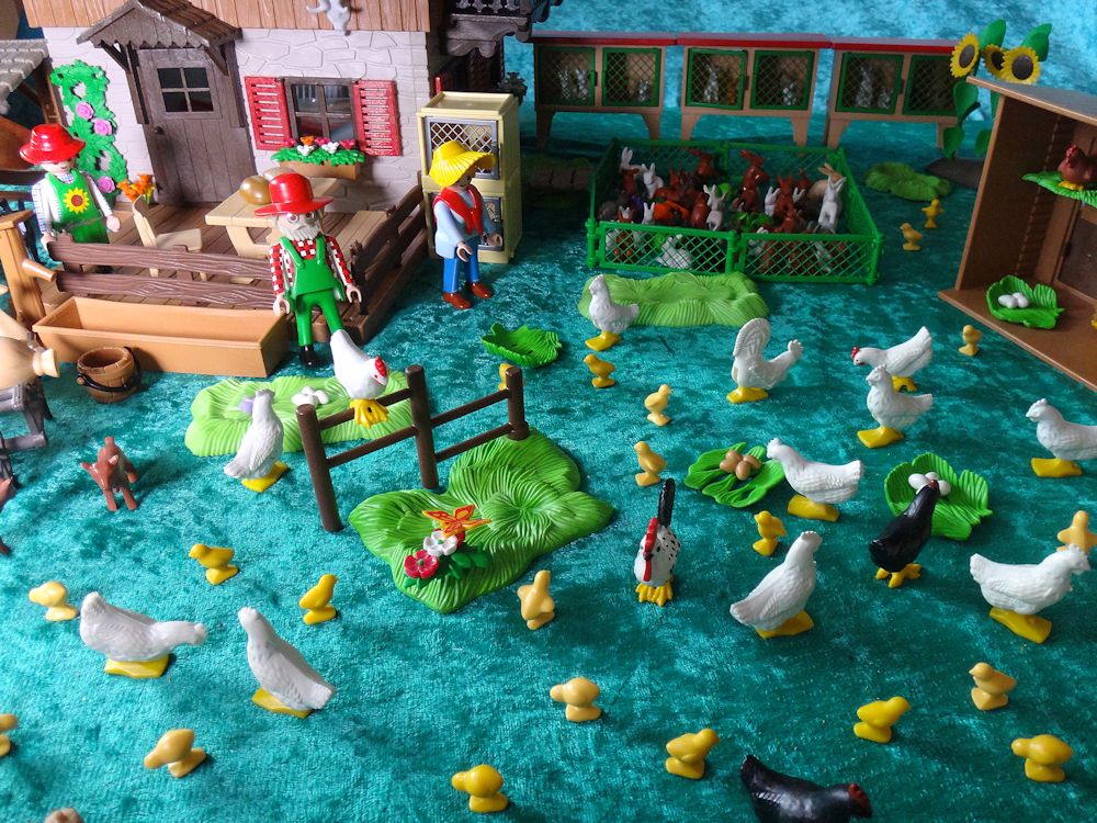 Hühner, Kücken, Kaninchen - alles springt munter umher.