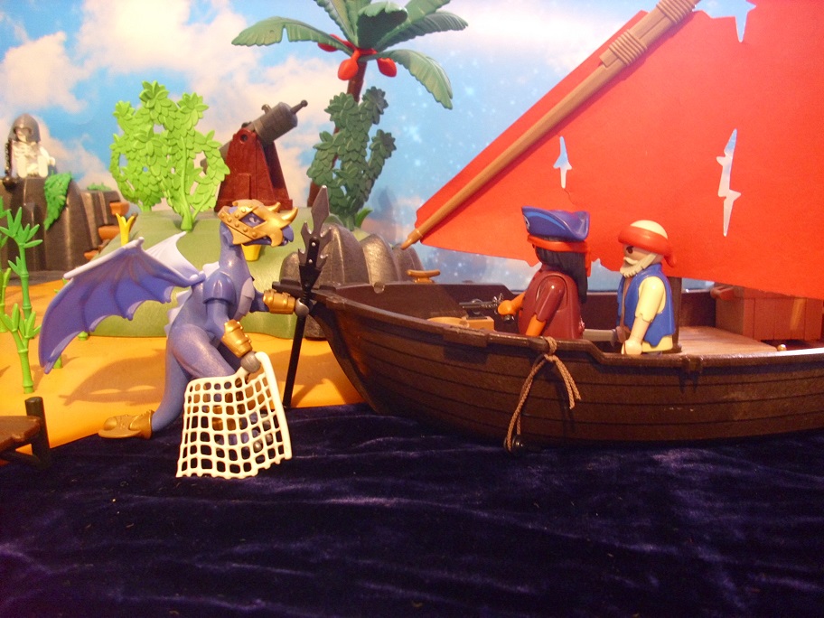 Aber gerade als sie an Land gehen wollen, erscheint vor dem Steg ein blauer Drache.