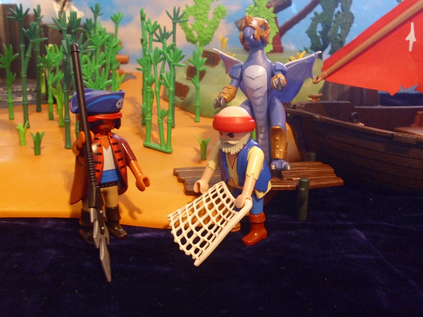 Jack und Jim haben nichts zu verlieren und gehen darauf ein. Der Drache überlegt kurz und sagt dann: „Sucht mir was zu essen.“ Und er gibt ihnen sein Netz und seine Harpune.