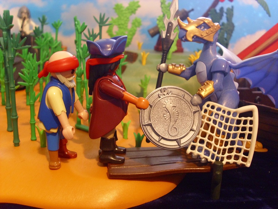 „Ihr dürft ihr nicht an Land. Es sein denn, ihr erfüllt mir eine Aufgabe.“ Jack und Jim haben nichts zu verlieren und gehen darauf ein. Der Drache überlegt kurz und sagt dann: „Sucht mir was zu essen.“ Und er gibt ihnen sein Netz und seine Harpune. Es dauert nicht lange und die beiden haben ein paar Krebse gefangen. „Gut, ihr dürft an Land. Und hier habt ihr die erste Scheibe zum Eingang der Schatzhöhle.“ Etwas irritiert nehmen sie die Scheibe und gehen Es dauert nicht lange und sie treffen auf der Insel auf einen weiteren Drachen.