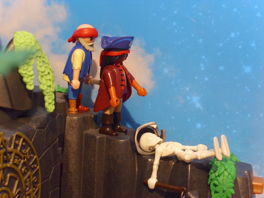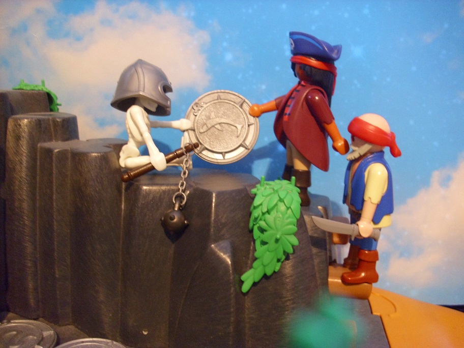 Also steigen die beiden auf den Felsen. Und da sitzt ein Skelett mit einer diese Münzen in der Hand“