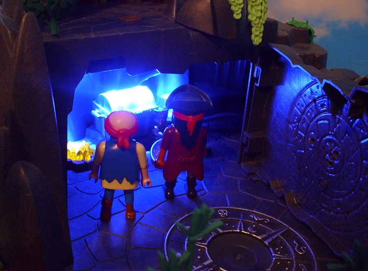 Da stehen in leuchten blauem Licht unglaubliche Schätze. Goldene Statuen und Kisten voller Gold