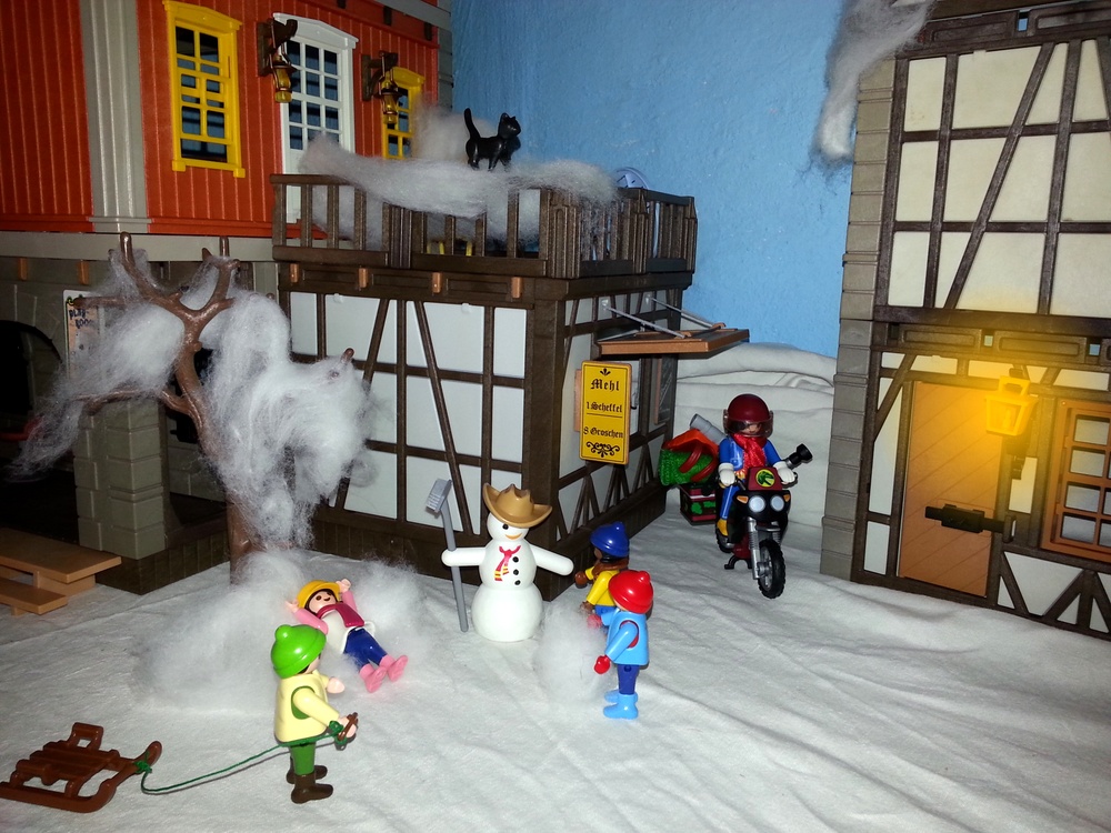 Playmohausen scheint ein recht überschaubarer Ort zu sein. Auf den Straßen ist wenig los, naja, bei dem Wetter! Nur einige Kinder haben viel Spaß mit dem Schnee.