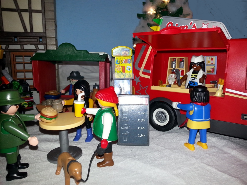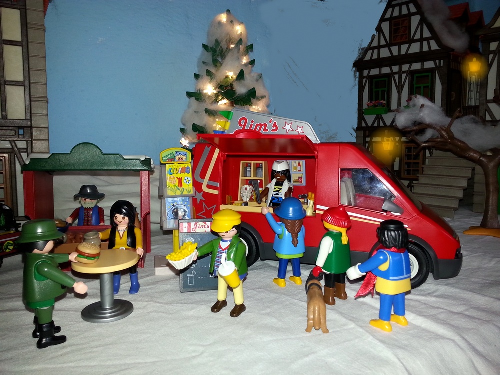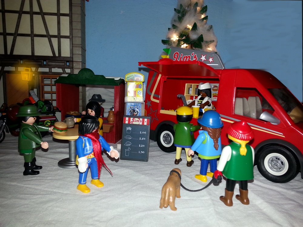 Auf dem Marktplatz herrscht noch reges Treiben. Ein Christbaum, eine Glühweinbude und ein Würstchenstand dienen als Anziehungspunkt für die Stadtbewohner. Jims Würstchen scheinen gut zu sein, von der Länge der Schlange her zu schließen.