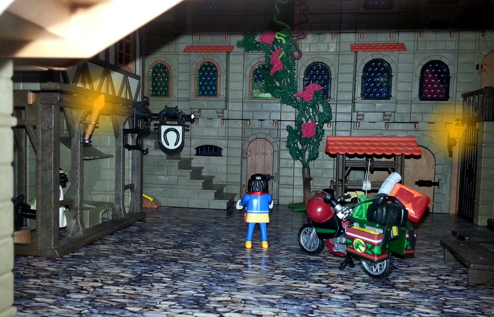 ...und stelle mein Motorrad im Hof ab. Aus der Schmiede höre ich Gehämmer. Ich gehe aber vorbei, zur Haupttreppe.