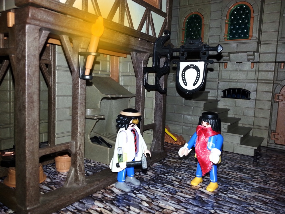 Frustriert gehe ich die Treppe wieder runter. Da taucht eine weitere merkwürdige Type aus der Schmiede auf. Hat der jetzt wirklich im Laborkittel am Amboss gestanden?