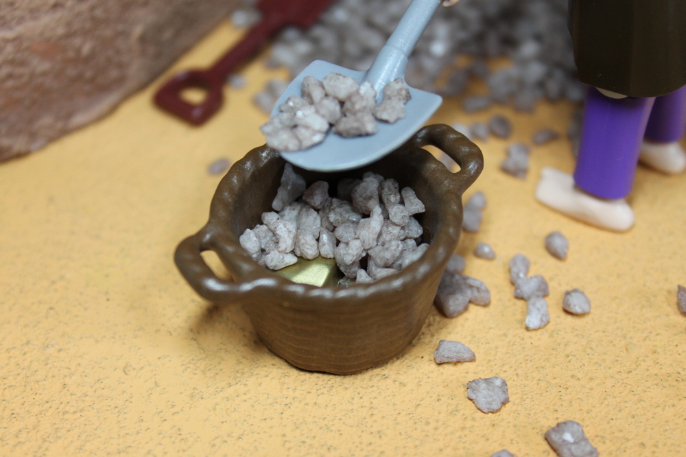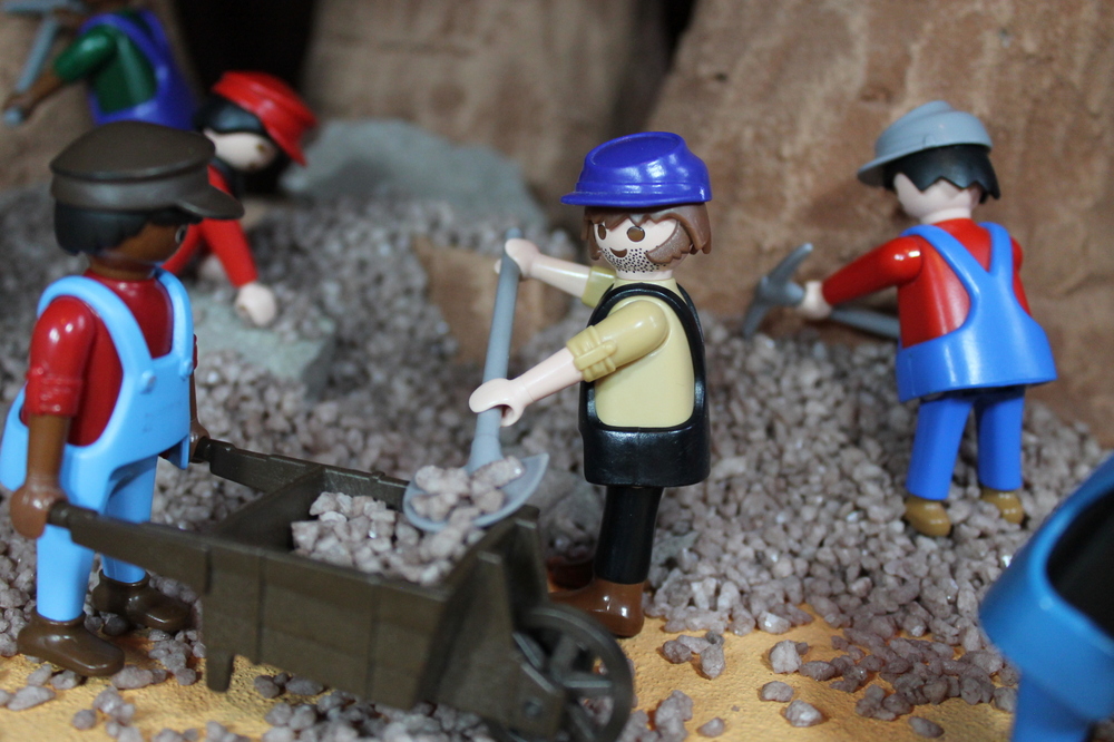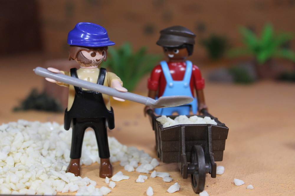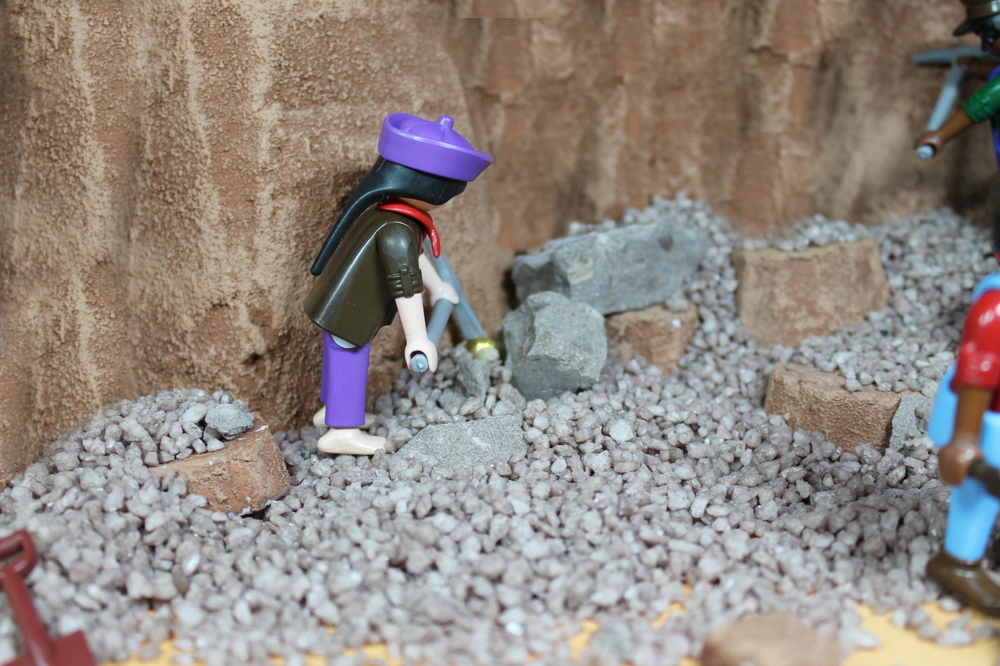 Nach der Sprengungen mussten alle kräftig mithelfen die Felsbrocken wegzuschaffen.