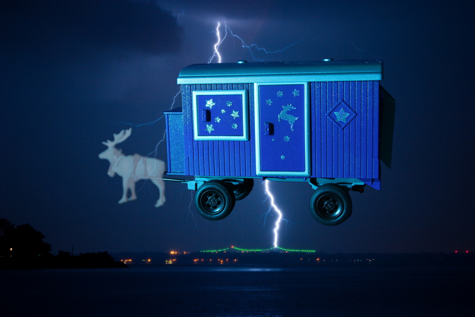 Der rentierlose Wagen stürzt krachend zur Erde. Er streift einige Baumwipfel mit den Rädern und kommt dann am Ende einer kleinen Straße mit einem Rumpeln zum Stehen.