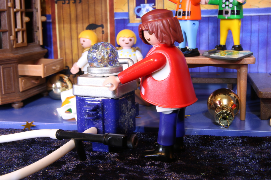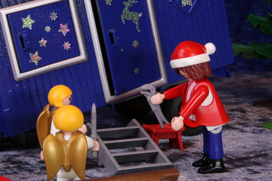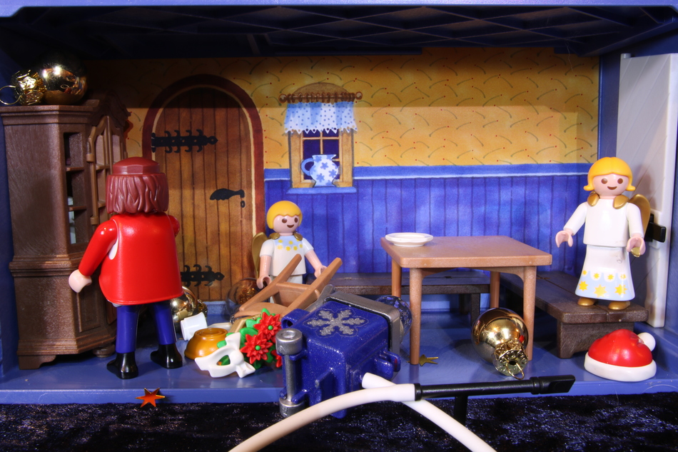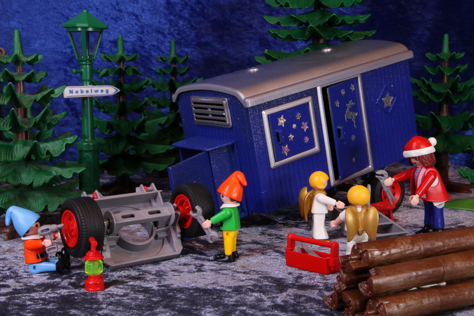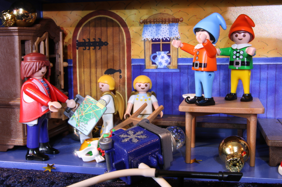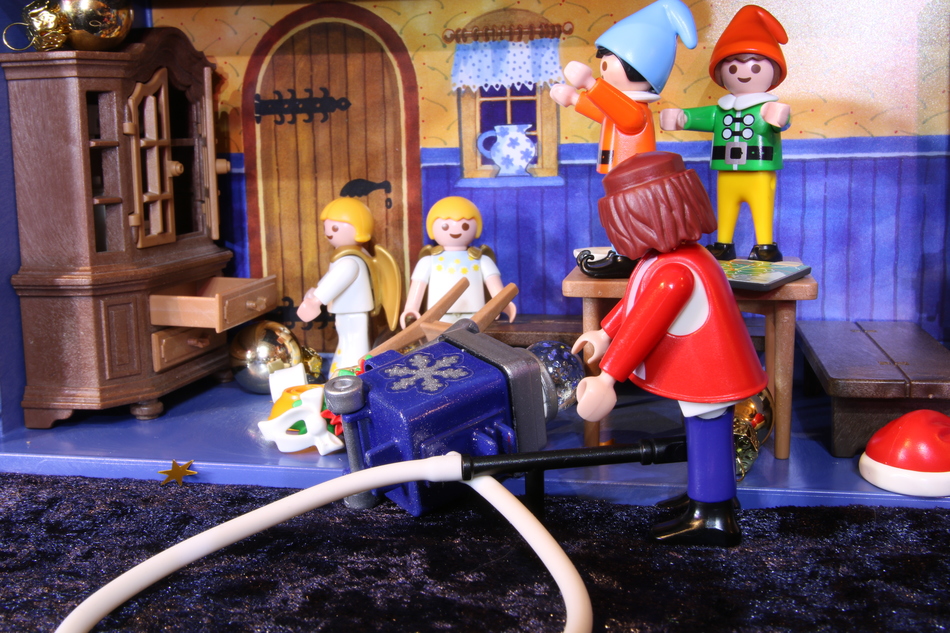 Gemeinsam treten Niklas Julebukk, die beiden Engel Matilda und Emmanuel sowie die Kobolde Fliegenbart und Kleckerbart ins Freie. Sie besehen sich den Schaden von außen. Flink werden Werzeuge herbei geholt, um mit dem Reparieren zu beginnen.