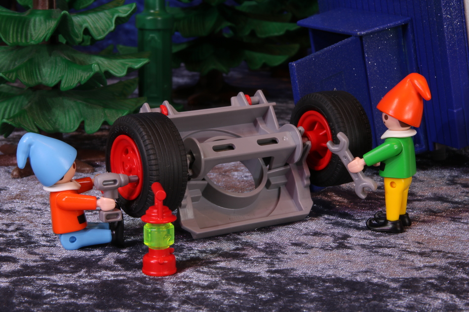 Julebukk fragt die Kobolde: "Wie lange werdet ihr brauchen, um den Wagen wieder herzustellen?"