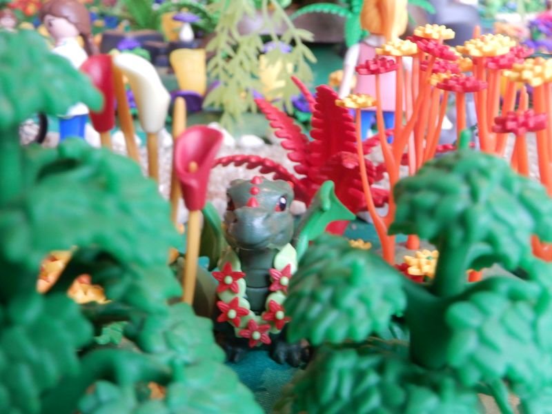 Den kleinen Drachen mit der hübschen Blumenkette, der sich hinter ihr im Grün versteckt,