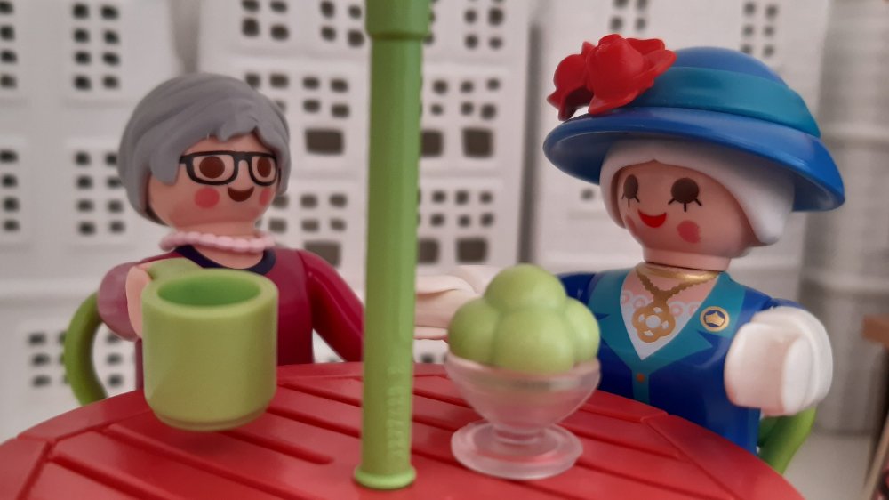 Eines schönen Tages saßen Annette und Lucy mit den Omas an Ediths Erdbeerbude und Merles grüner Bude und genossen Tee und Eis.