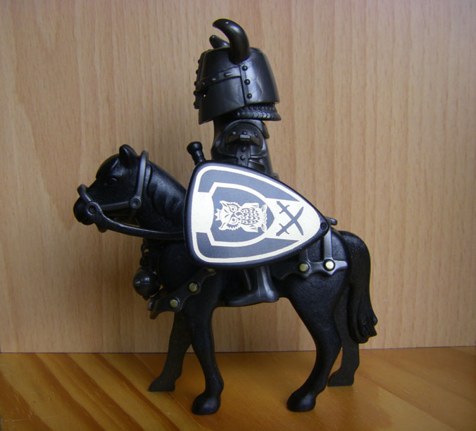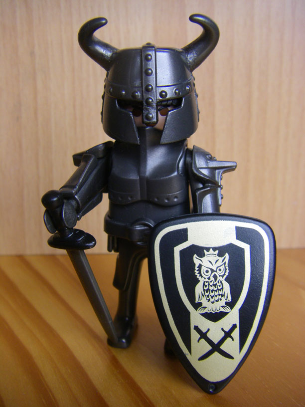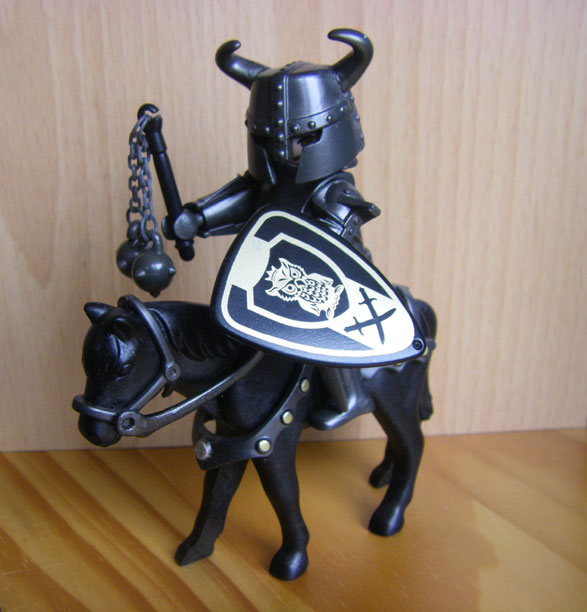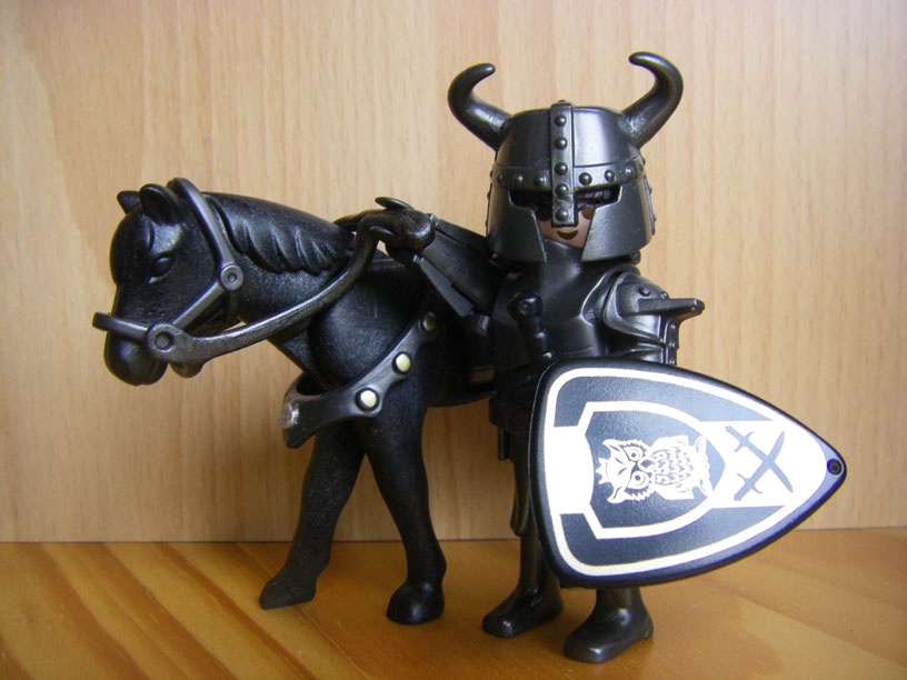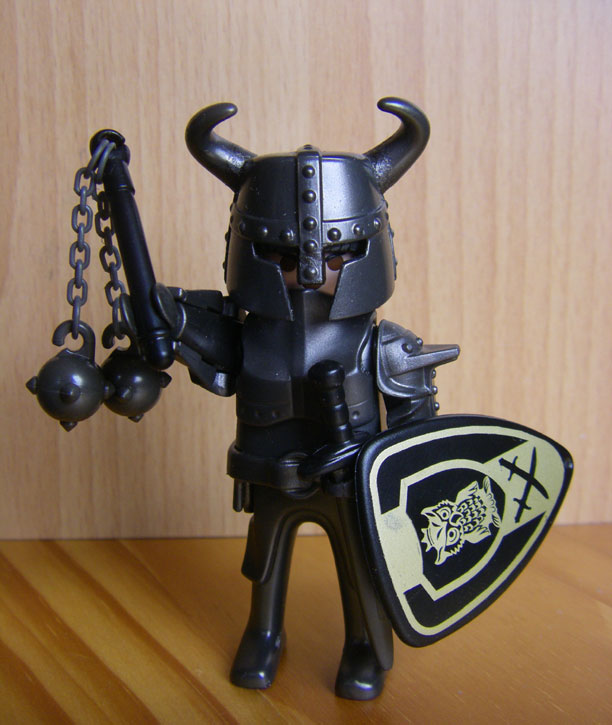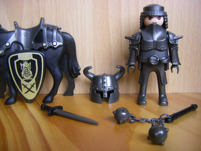 Wollte schon immer mal einen Ritter in voller Anthrazit-Rüstung haben. Da isser, mit allen Raffinessen. Helm von den Raubrittern, Hörner von den Barbaren. Das Schwert kombiniert aus schwarzem Griff und Anthrazit-Klinge, konsequent zum Morgenstern (ebenfalls schwarzer Griff und die "Auslage" in Anthrazit).