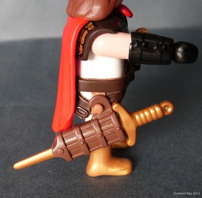 Und nun die gewollten Veränderungen: Da Caramon Linkshänder ist, passt die Schwertscheide auf der rechten Seite optimal - ansonsten finde ich sie dort allerdings eher unpassend und frage mich, was sich die Entwickler von Geobra dabei gedacht haben. Nun wollte ich natürlich auch den Quergurt nachbilden. Damit das alles übereinander passt, müssen die Gurte extrem dünn gedremelt werden.