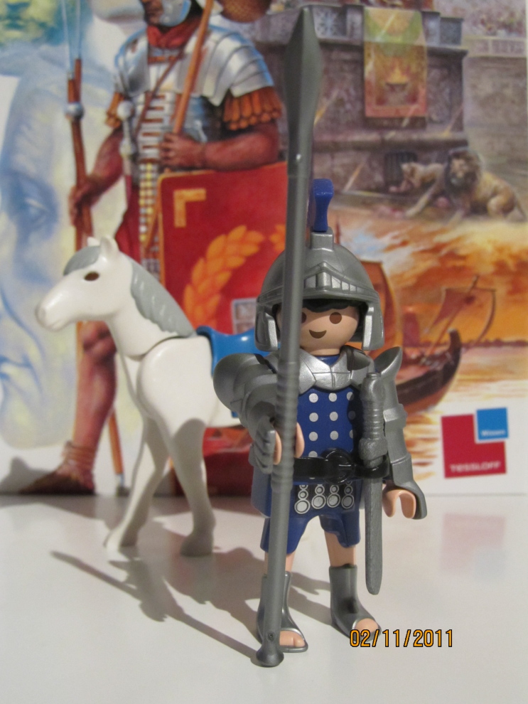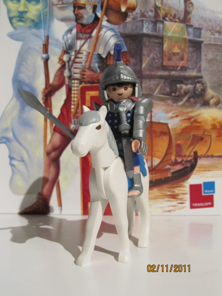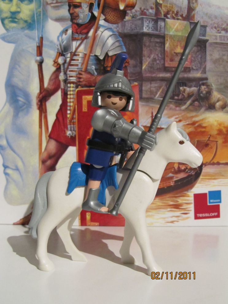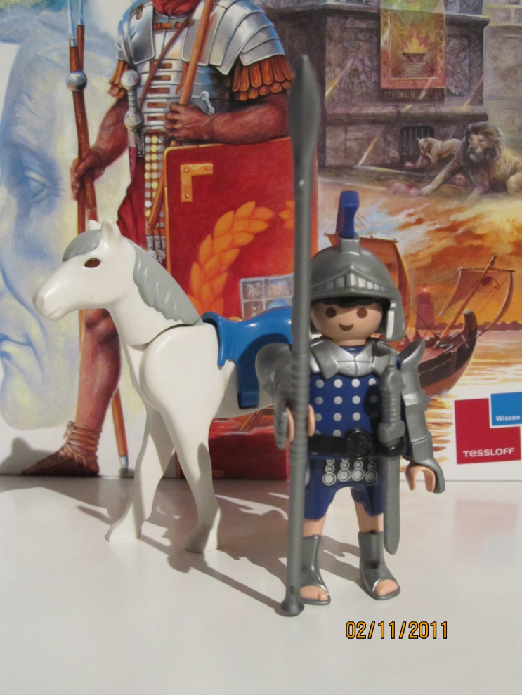 Die Römer hatten wohl ca. ab dem ersten Jahrhundert Kavallerie mit Maskenhelmen, Bauchpanzer und Armpanzern, vorallem Hilfstruppen in Germanien. Diese Helme wurden auch bei der Schlacht des Arminius gefunden. Leider gibt es von Playmobil noch nicht solche tollen Helme. Ob die Panzer nun so wie bei mir aussahen weiß ich auch nicht genau, mir haben sie auch gut gefallen. Aber ich habe noch einen gesteckt, der mir noch etwas besser gefällt. Mit armschienen und keiner richtigen Rüstung, sonder nur eine Panzerung.