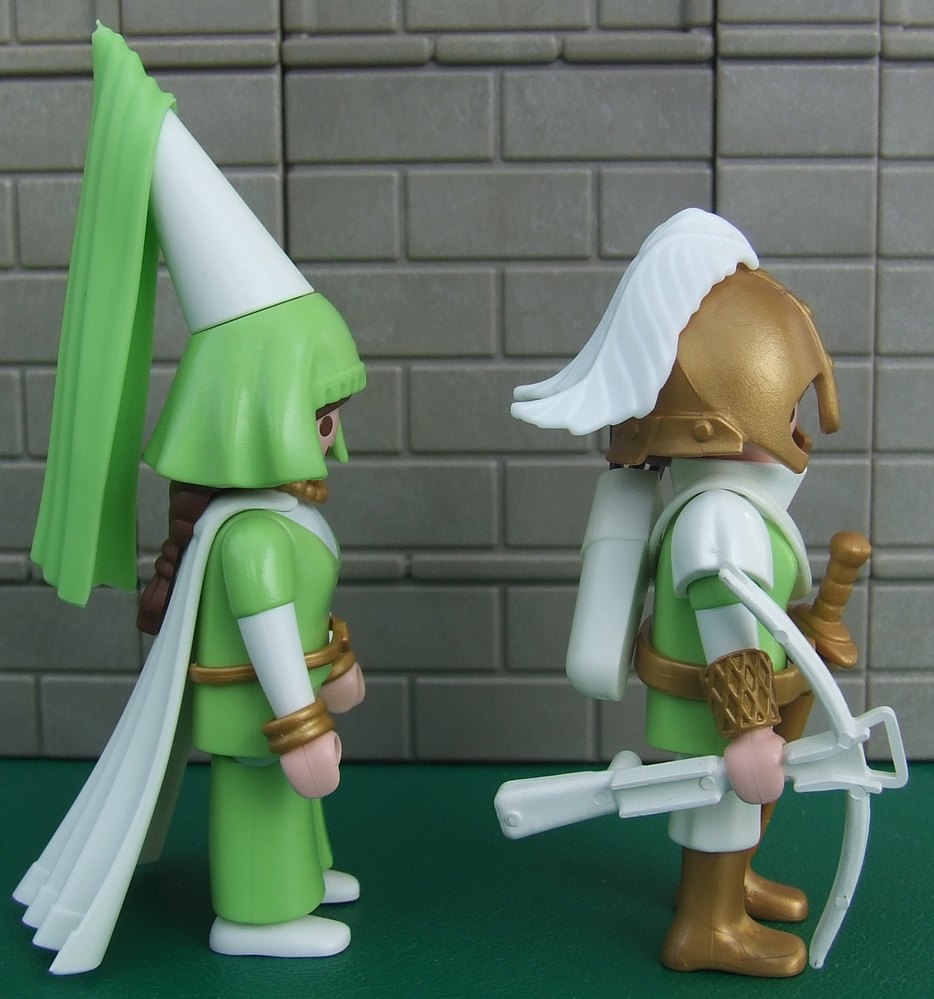 Nun folgt eine neue Schöpfung. Diese ist wieder "nur" mit Bajonett-Kopf gesteckt, weil ich mir damit noch nicht ganz so sicher bin. :nixweiss :gruebel Ich habe als Alternative zu den Gold-Teilen silberne Teile ausprobiert, weil es da ja auch die schönen grünen Beine gibt, aber das sah in beiden Versionen ziemlich blass aus. :huh Für weitere Anregungen und Verbesserungsvorschläge bin ich hier besonders offen. :dank1 Ich experimentiere gerade noch an einem passenden Pferd, aber da sind die farblich passenden Teile wahrlich dünn gesät! :gruebel :gruebel