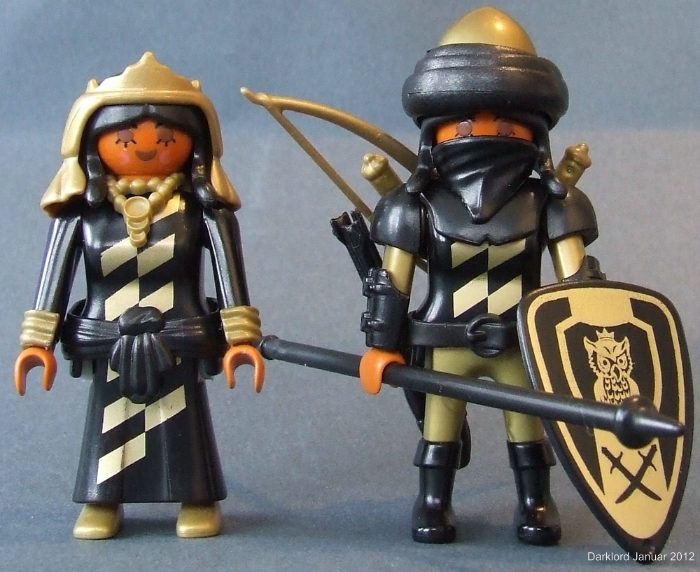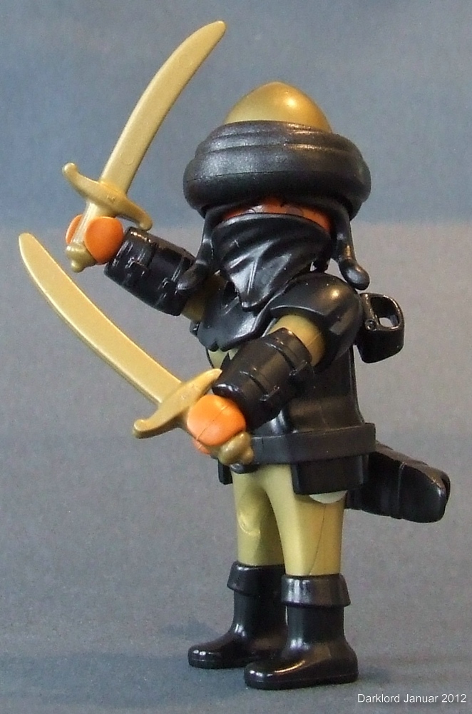 Zunächst mal Bilder einer Kriegerin, die Avienda heißen soll: Hier bin ich vom Schild ausgegangen, weil ich dazu noch keine passende Kriegerin hatte. Schwarz, Alltgold und zwei Krummsäbel waren damit quasi vorgegeben. Bei der Teilesuche ist mir dann ein Schenk-Helm in die Finger geraten, der zwar farblich passte, aber von der Form her grottig war. Da fiel es nicht schwer, ihn zu zerdremeln und damit den Helm zu customizen.