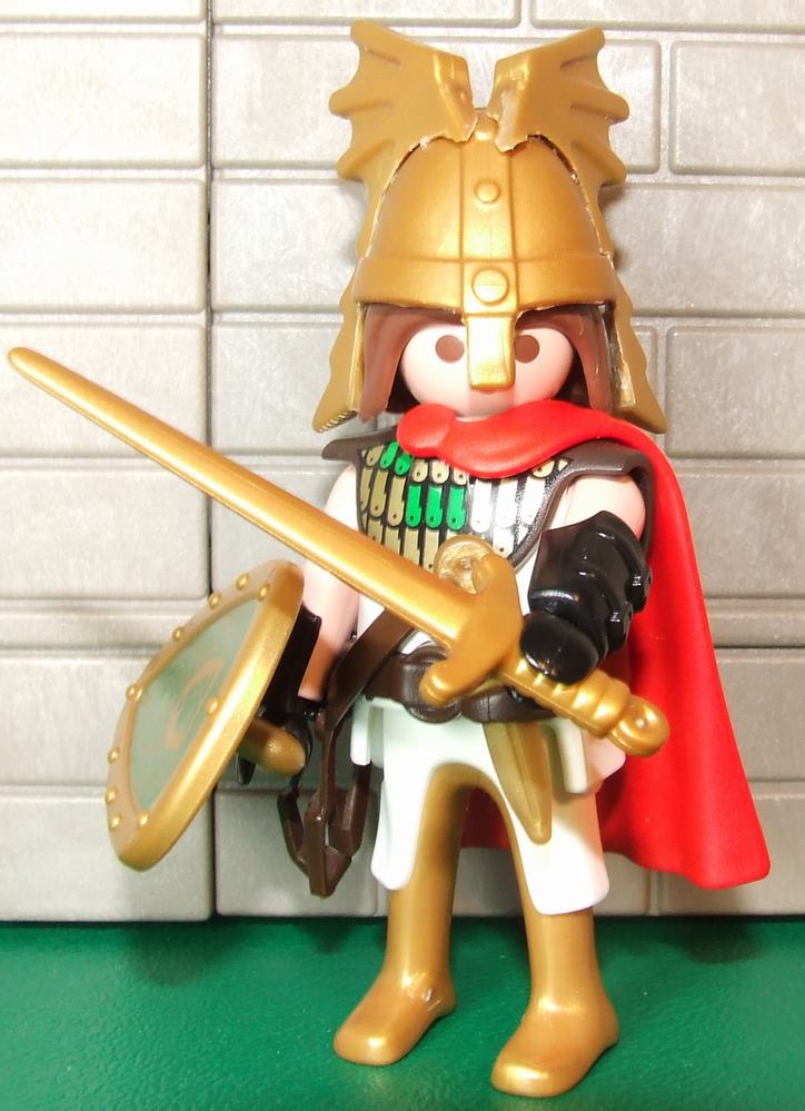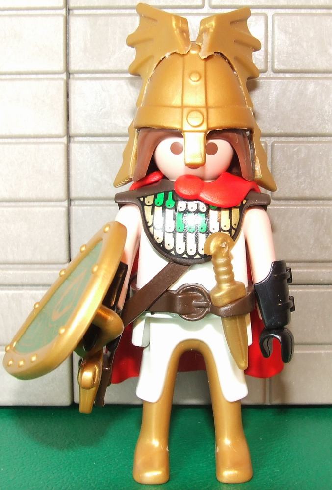 Zum "Schuppenpanzer" fällt mir noch folgendes ein.Auf dem gemalten Bild hat der Schuppenpanzer einen leichten Grünton . Vielleicht kannst du den Oberkörper dieser Figur30 00 5752 - Elven warrior, blond hair, green suit, brown boots nehmen. Eventuell sollte man dann noch den dunkelgrünen Gürtel wegradieren. Und als Beine eventuell Beine eines Römischen Tribun ? Auch hier noch den Druck entfernen. Dann hast du aber halbnackte Beine