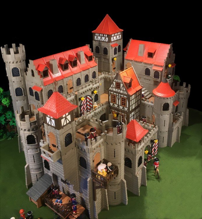 Einen Rundturm habe ich gekuerzt, dafuer 2 weitere Rundtuerme angefuegt. Das Fachwerkhaus habe ich auch minimalst gedreht, so dass die geschlossenen Waende nach vorne schauen. Jetzt hat die Burg fuer meinen Geschmack genug "Ecken und Kanten"... zumindest fuer jetzt![]()