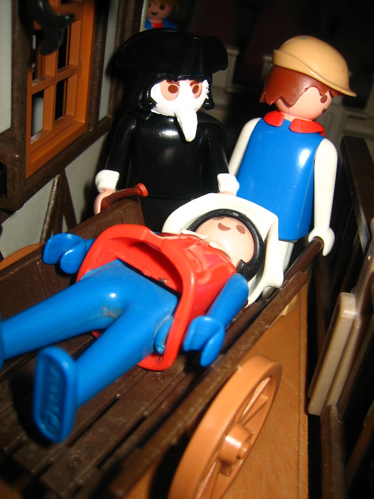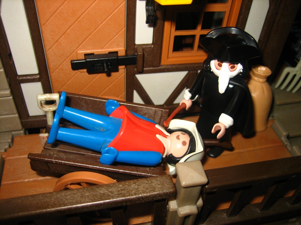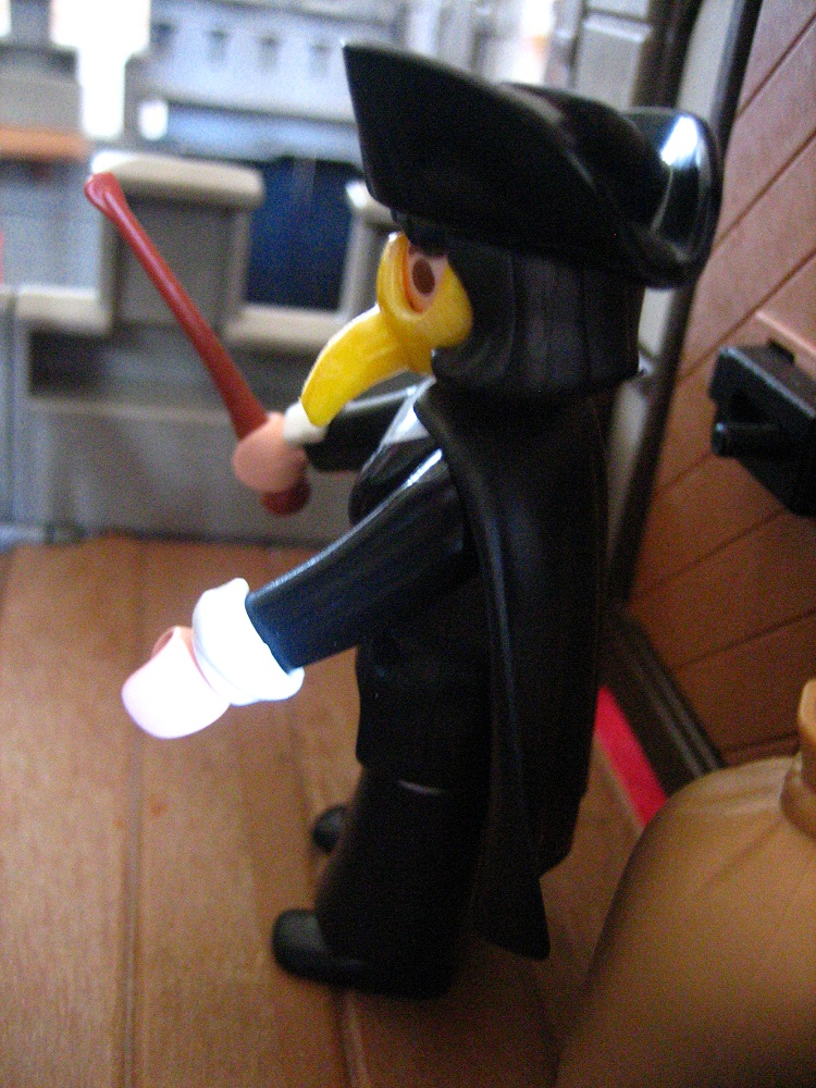 Könnte das sein, daß der Doktor auf dem Bild eventuell doch einen Degen/Rapier trägt? Ich bilde mir ein, die Parierstange direkt über der Hand zu erkennen...