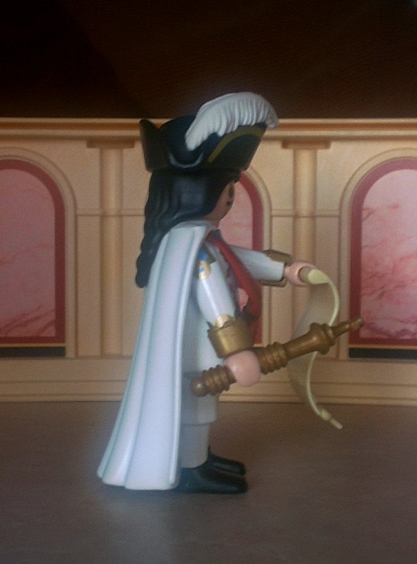 Jetzt mit weißen statt dunkelblauen königlichen Umhang, wovon den Kragen "chirurgischerweise" abgeschnitten wurde, und er trägt dieselbe lange-Haare-Frisur wie die 1sten Figur.