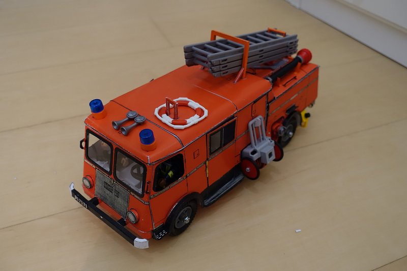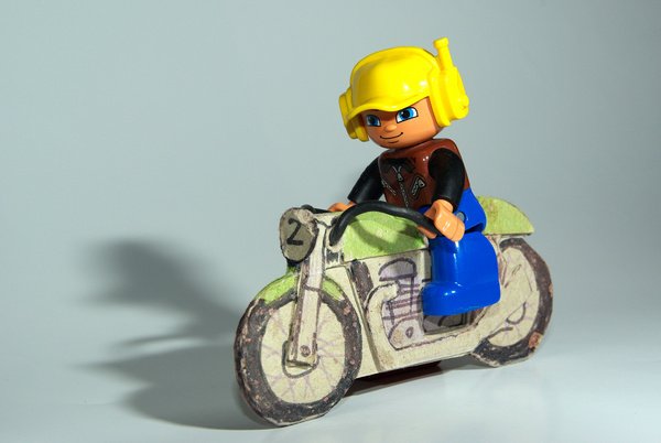 Schnell ersetzt sind eigenzlich nur die Taucherbrille und die Ski. Die Mützen sind schon deutlich aufwendiger. Ich habe sogar meine alten Lehrbücher konsultiert wie man eine Kegelabwicklung konstruiert. Die Kamera ist komplett aus schwarzen Fotokarton, heute würde ich den Griff etwas anders gestalten. Das Motorrad ist nur aus dieser grauen Rückpappe vom Zeichenblock und mit Filzstift bemalt, das Foto zeigt allerdings auch den Zustand nach 2 Jahren spielen damit. War eigentlich auch nur als Prototyp gedacht, aber so gut angekommen das es dabei geblieben ist. Zum Feuerwehrauto kam es ganz spontan nachdem mein Sohn(4) dieses kleine Glöckchen anbrachte und sagte ich solle ihm daraus die Bessie bauen.