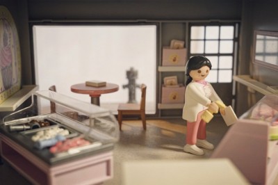 Der Laden ist mit viel Liebe eingerichtet worden. Der Riesen CupCake an der Wand und der Spiegel geben viel Atmosphere. Woher stammt eigentlich der lila Eisbescher auf dem Tisch mit Strohhalm? Das passt auch sehr gut zu Playmobil.