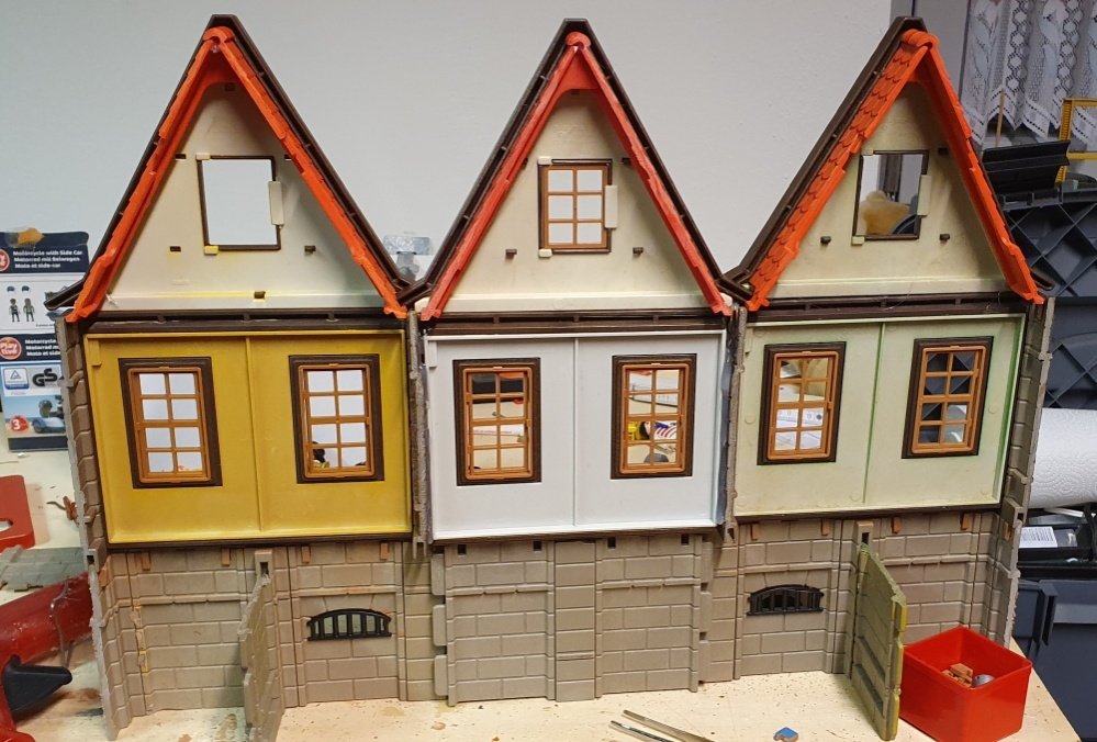 Die Häuserreihe schaut - finde ich - von den Proportionen her deutlich besser aus. Auch hier fehlt noch der richtige Unterbau. Außerdem werden die Fenster noch ein "Innenleben" bekommen - wenn alles so klappt, wie ich mir das wünsche, mit einem kleinen Gimmick. Mal gucken...