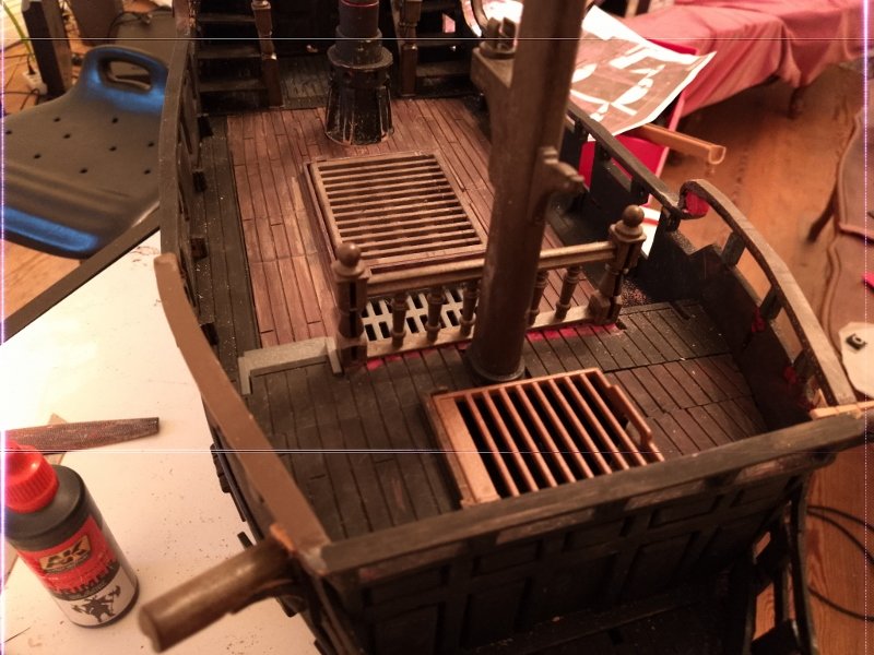 Was mich wundert, ist die Anordnung des Steuerrades zur Seilrolle. Der Steuermann steht doch achtern des Rades. Dann muß er aber immer über die Seile greifen. Oder er steht seitlich und kann das Rad dann ned mit beiden Händen sicher fassen...