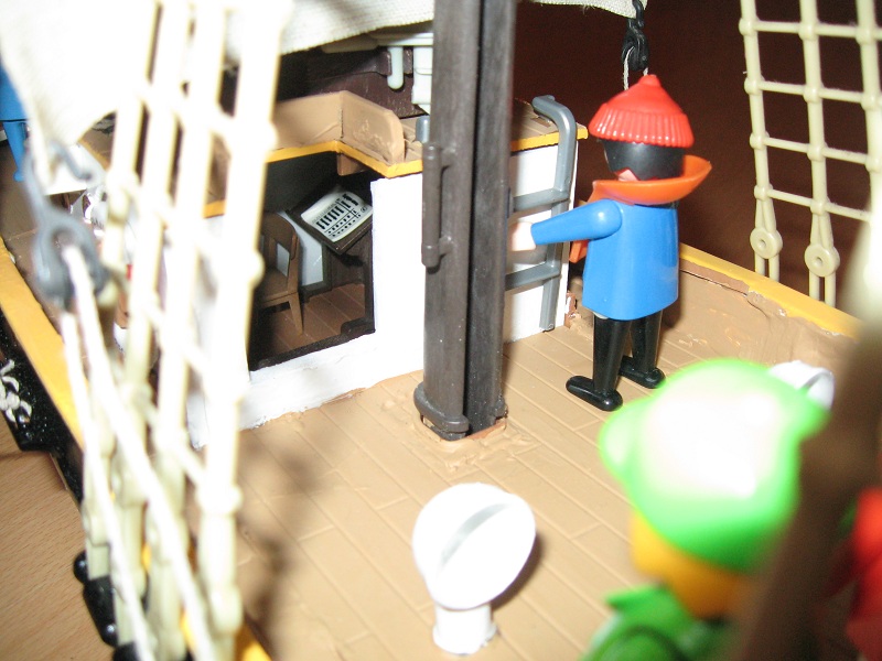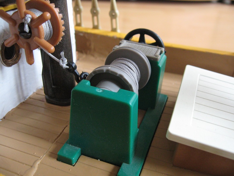 Anschließend wurden dann die fehlenden Decksstellen eingearbeitet, wobei u. a. Laderaumböden 3550/ 3750 zum Einsatz bekamen. Ursprünglich wollte ich sowohl vorn als auch achtern eine Ladeluke anordnen, verwarf jedoch die achtere zugunsten des Kompaßturmes. Das Ruder ist mit Doppelrädern ausgestattet, wie man es von den großen Windjammern der letzten Jahrzehnte kennt. Das Kartenhaus ( Deckshaus mittschiffs ) ist zwischen Groß- und Kreuzmast angeordnet und tief in den Schiffsbauch eingelassen, um es flacher halten zu können. Ein Niedergang vom 3550 dient dazu, daß die Figuren das komplett eingerichtete Kartenhaus auch betreten können. "Gedeckt" wurde es mittels eines zurechtgesägten Laderaumbodens und dann mit einer Windhutze im Öffnungsbereich versehen. Klampen, das Nebelhorn, Bulleyes von Graupner, die Fischkutter- Positionsleuchten sowie Rettungsringe auf beiden Seiten vervollständigen das Deckshaus. Am Bug wurde der Galion ( Krulle ) eines 350 in den Bugbereich eingepaßt und verspachtelt, um den Klüverbaum tragen zu können. Auch die Back ( Vordeck ) wurde etwas erhöht angelegt, um sich vom Hauptdeck abzugrenzen. Die Deckswinsch des Kutters wurde ebenso beibehalten wie eine der Winden des 3550 am Großmast. Auch wurde die "Panama" mit zwei Ankern ausgerüstet... könnte ja mal eine Kette brechen. Das Ankerspill auf der Back bewegt die Kette des Backbordankers... der Steuerbordanker ist mit der Kette unter der Back festgesetzt. Zusätzlich wurde das Besansegel des Schiffes zweigeteilt; d. h. ein sogenannter "deutscher" Besan mit zwei separaten Segeln geschaffen.