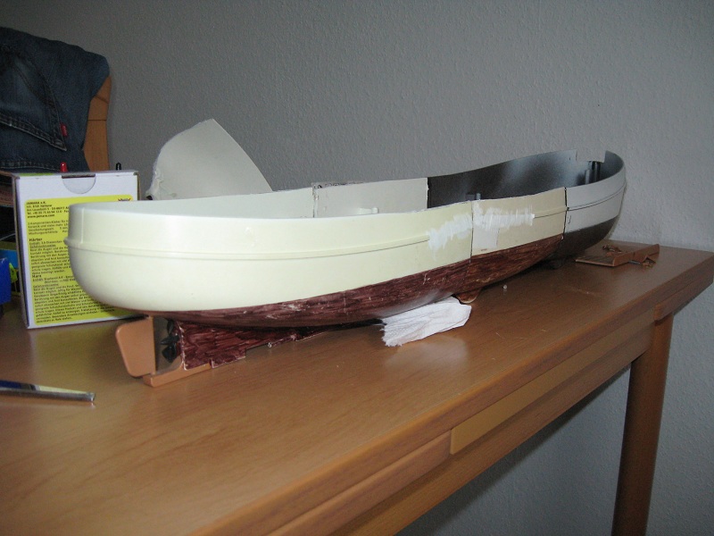 Desweiteren wurden mehrere Ersatzteilspender- 3550 bzw 3750 ( auch nicht mehr dolle ) herangezogen. Das von mir entworfene Schiff stellt eine stählerne Viermastbark dar, die als relativ moderner Windjammer auch bereits einen Hilfsmotor hat ( Auxiliarsegler ). Dabei wollte ich kein revolutionäres Rigg entwickeln, sondern hielt mich im weitesten Sinne an die vorhandenen Takelagen des 3550 ( also nur ein Rahsegel je Mast, obwohl mich auch mehrere begeistert hätten ). Hierzu wurden in die drei aneinandergeklebten und gespachtelten Kutterrümpfe zunächst passende Deckspartien eingesetzt und später durch Mastfundamente des 3550 ergänzt.