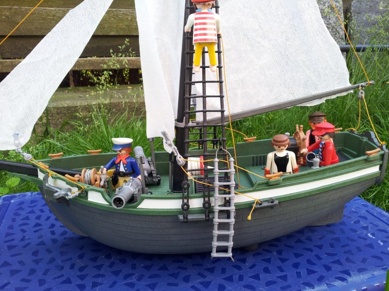 Das Boot (noch namenlos....) mit einigen Veränderungen. Segel aus weissem Stoff, Wanten und Anker aus dem Set 3174 (der Anker ist da wenigstens aus Metall...... ), Reling in weiss aus Isolierband, passend mittels Skalpell geschnitten. Weitere kleine Umbauten sind in Planung.....